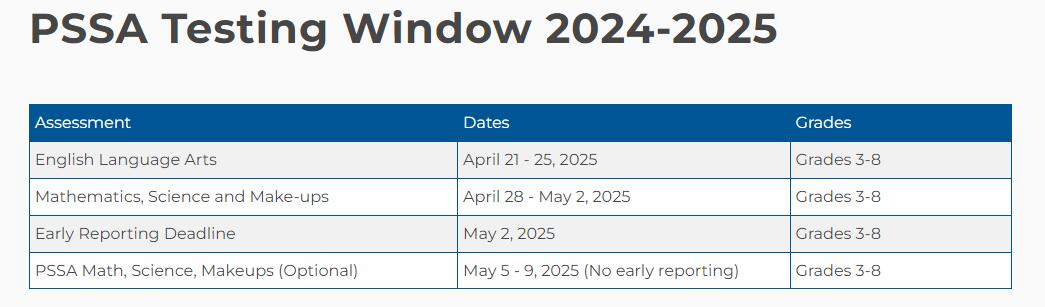 • PSSA Testing Window 2024-2025