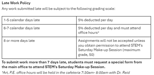Missing and incomplete assignments can be viewed on Genesis. If absent, each student will have two days to make up for a missing assignment. After that, a 5-point penalty will be taken off any assignment for each day if it is late. If a student is not absent, but failed to complete an assignment, they may request an extension by speaking with the instructor. A 5-point penalty will be taken off the assignment every day if it is not turned in within 5 consecutive days. For example, a homework or classwork assignment that is late for a period of 5 school days, without being excused, is only eligible to receive a maximum score of 75. Additionally, parents will be contacted when a student misses an assignment and administration will be notified. Excessive missing assignments will result in disciplinary action.
