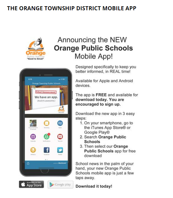 The Orange Public Schools mobile app for both Apple and Android devices is ready for launch! We invite you to stay connected while you're on the go with this FREE mobile app that will bring you the latest news and information about our schools.