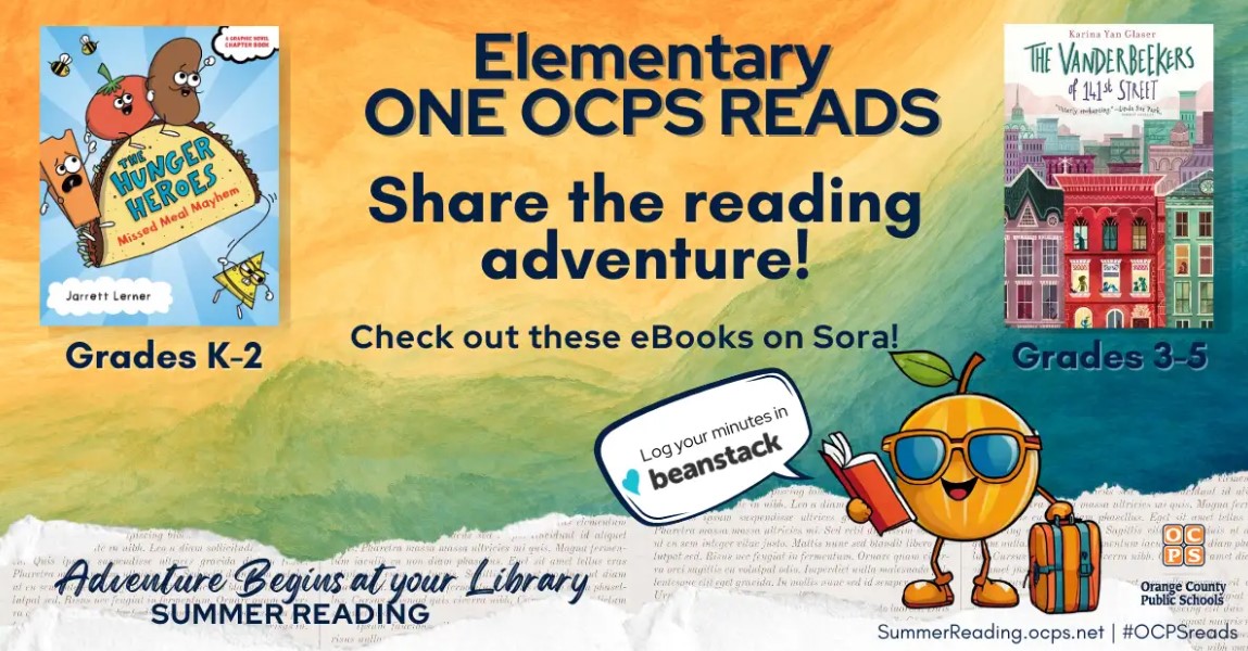 This year's Summer Reading Celebration includes a ONE OCPS Reads selection for elementary students. These titles are available as eBooks on Sora. Log those reading minutes in Beanstack!