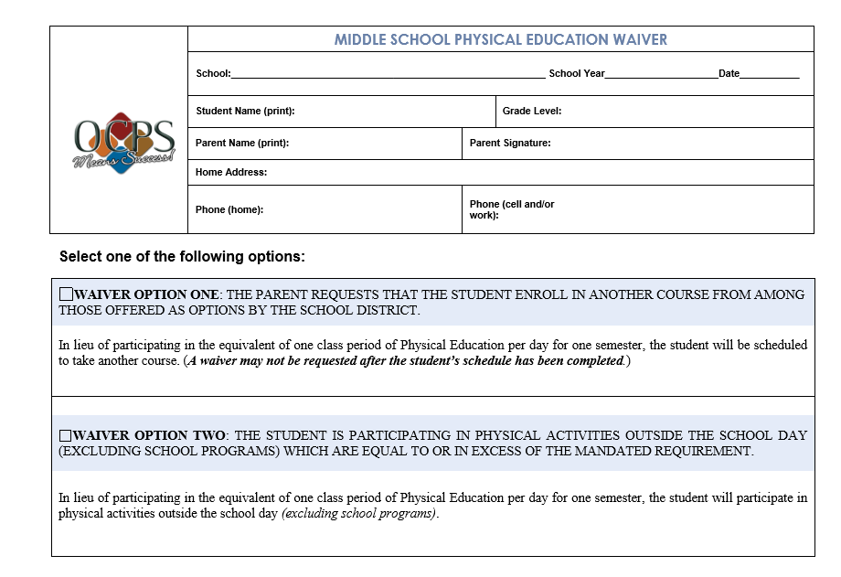 Your child must meet one of the waiver criteria listed above or he/she will be enrolled in physical education each year while in grades 6 through 8.