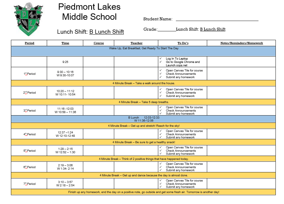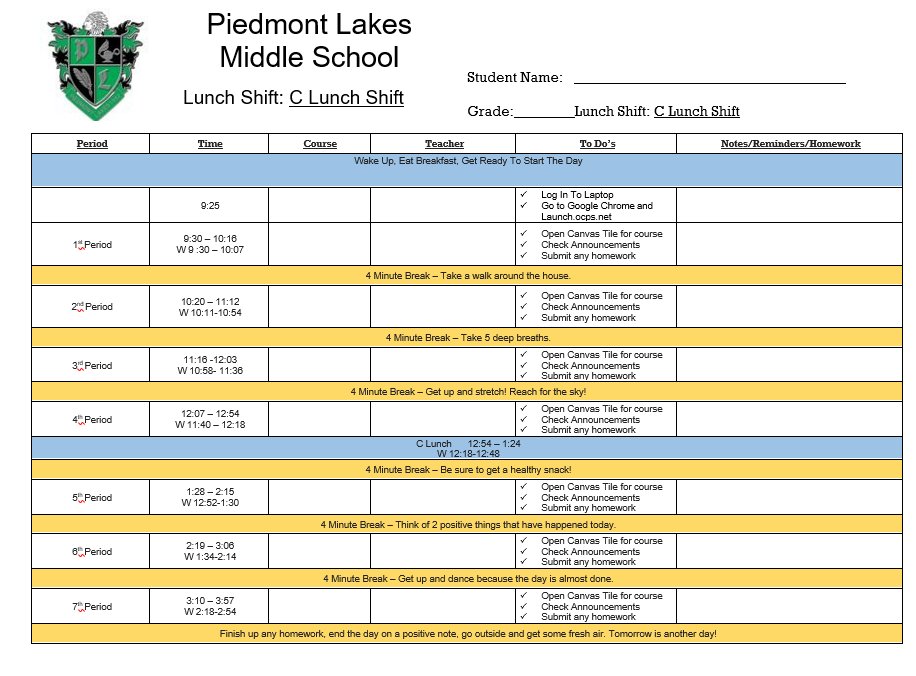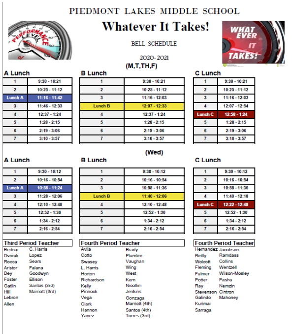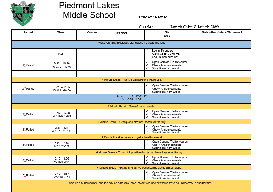LaunchEd@Home follows the Piedmont Lakes 2020-2021 bell schedule