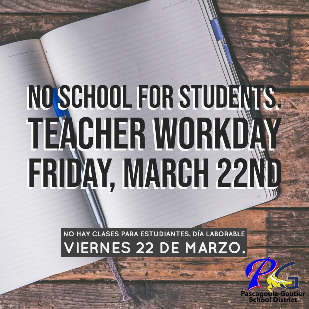 No School for Students Friday, March 22nd No school for students, Teacher Workday Friday, March 22nd No hay clases para estudiantes, día laborable viernes 22 de marzo. Print