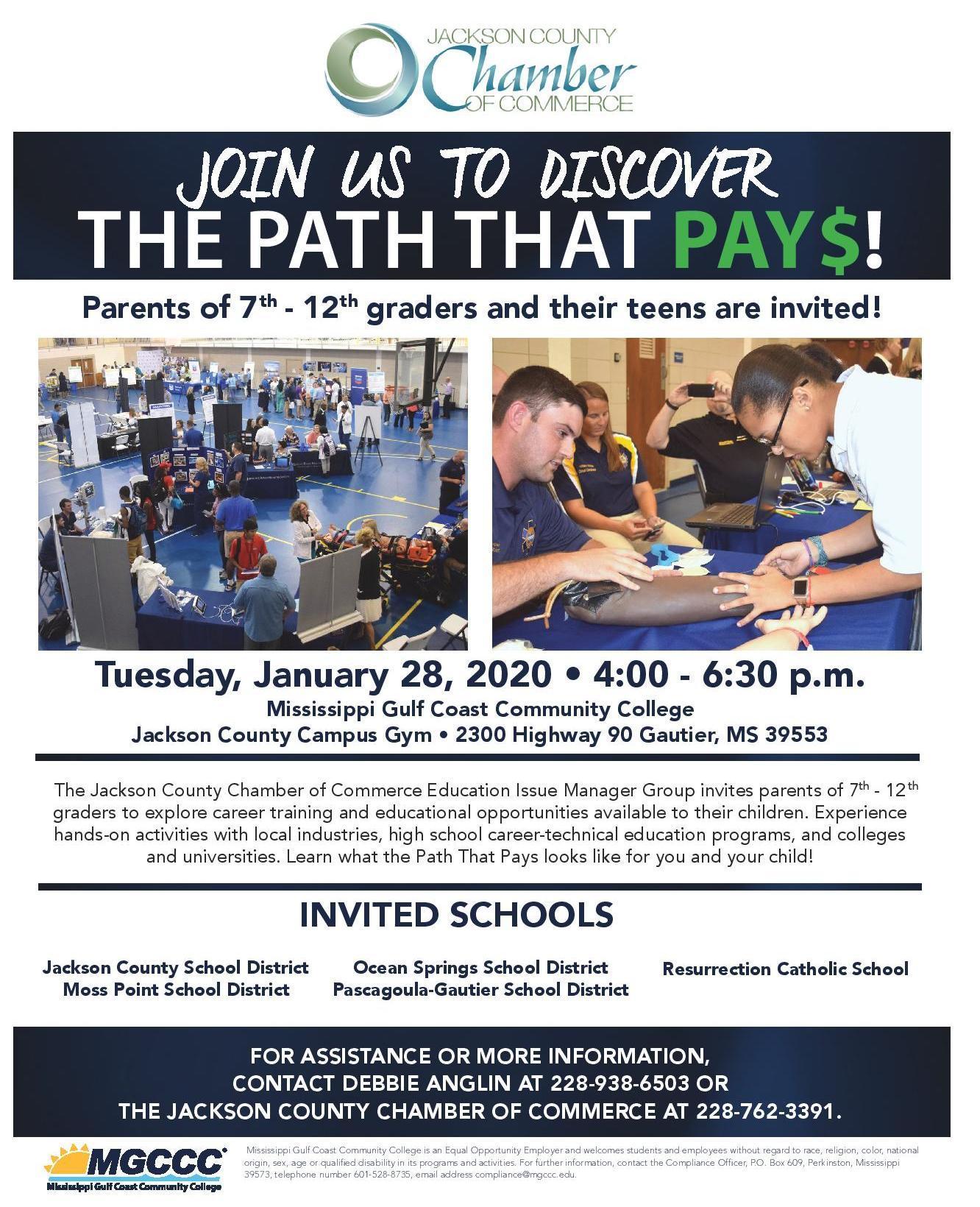 Tuesday, Jan. 28, 2020, 4-6:30 pm, at the MS Gulf Coast Community College for 7th-12th graders & parents. Learn about career training for your children through hands-on activities with local industries, high school career-technical programs, colleges & universities.