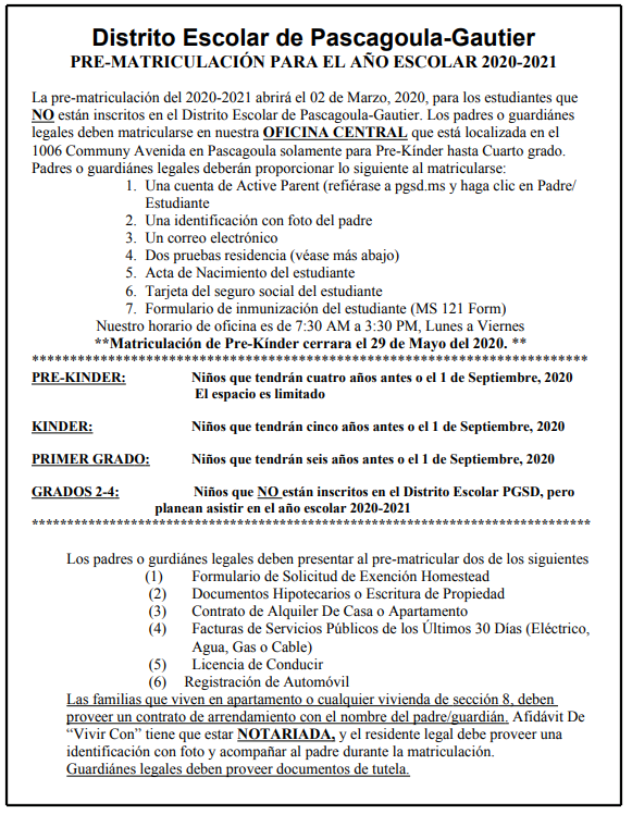 Pre-registration for the 2020-2021 school year opens on March 2, 2020. This is for students NOT currently enrolled in the Pascagoula-Gautier School District.