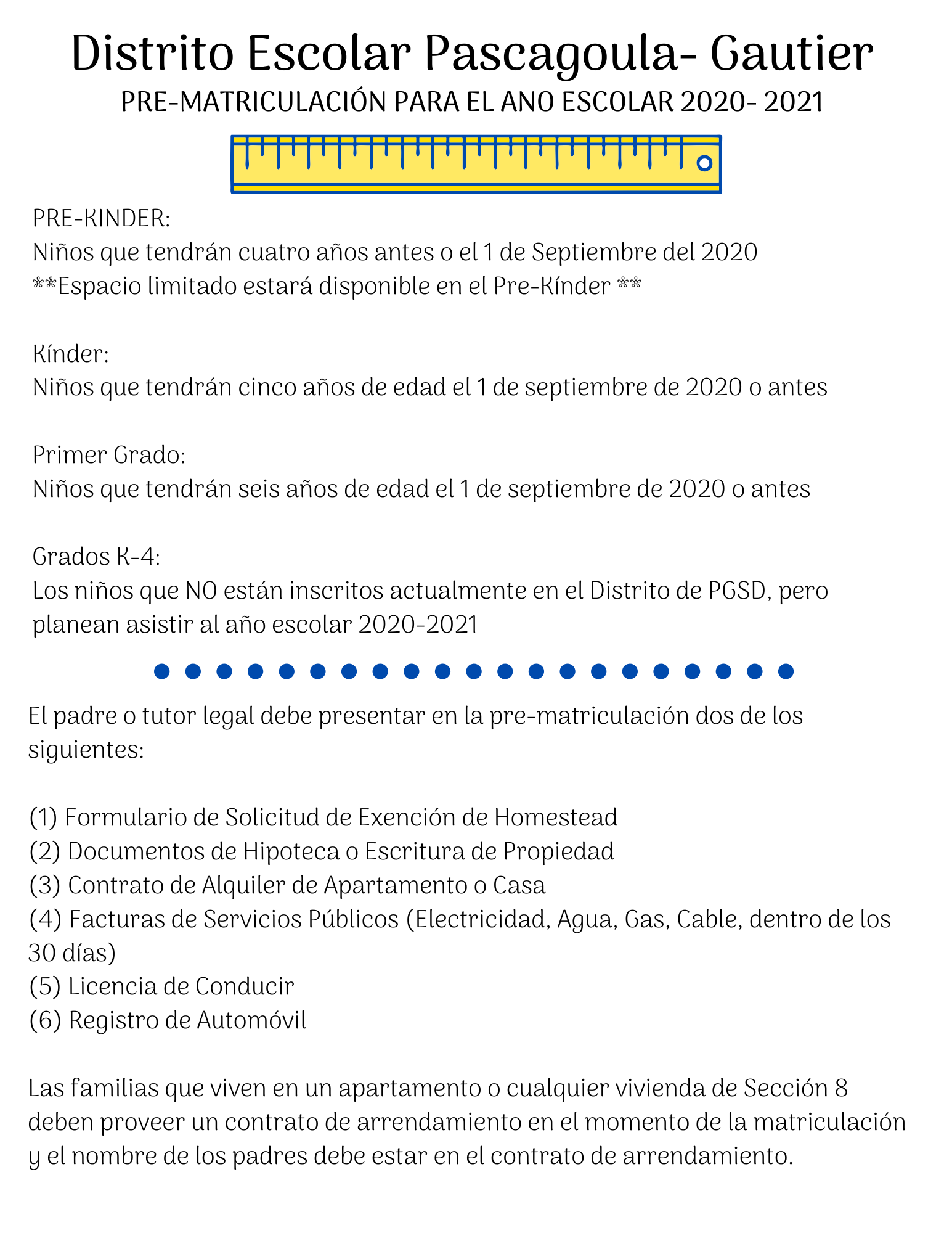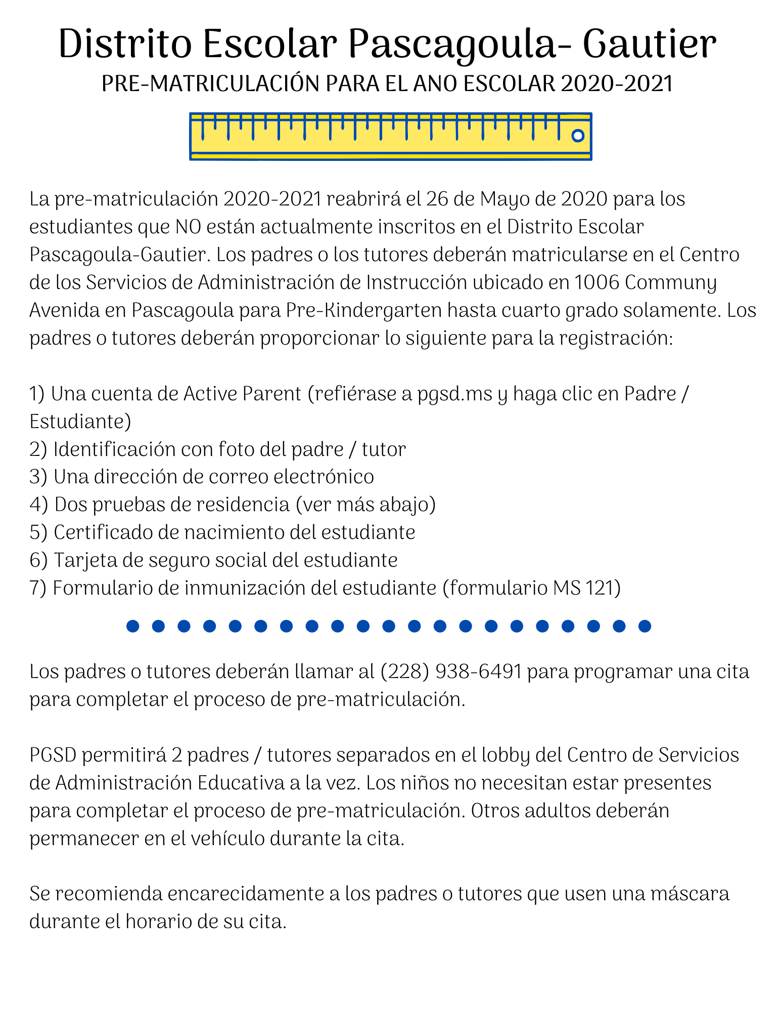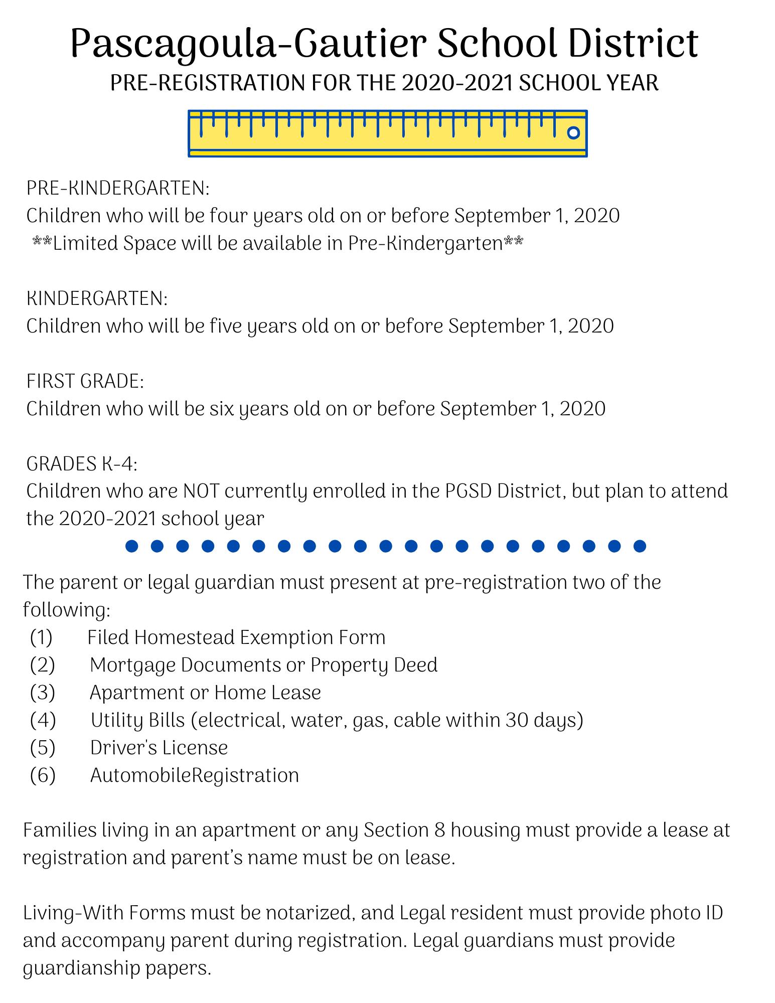 Starting Tuesday, May 26th, the Pascagoula-Gautier School District will begin conducting pre-registration for PreK, Kindergarten, and NEW students to the district for the 2020-2021 school year.