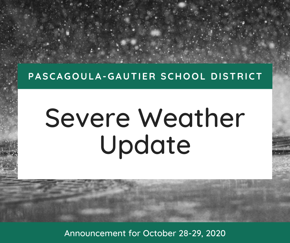The Pascagoula-Gautier School District will dismiss early Wednesday, Oct 28, 2020, due to the incoming inclement weather from Tropical Storm/Hurricane Zeta. Elementary schools will dismiss at noon; academies at 12:15 p.m. and middle and high schools at 1 p.m. Thursday, Oct. 29, 2020 will be a distance learning day for all students and all school buildings will be closed. Please stay safe and monitor our Facebook pages and website for further updates.