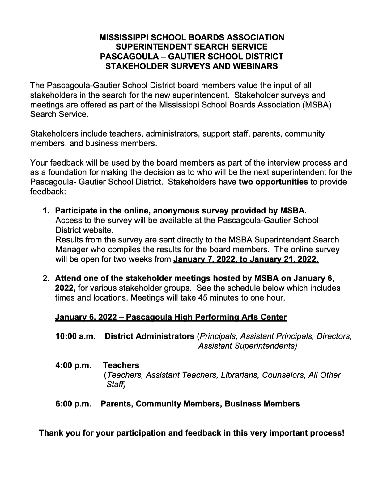 Access to the survey will be available at the Pascagoula-Gautier School District website. Results from the survey are sent directly to the MSBA Superintendent Search Manager who compiles the results for the board members. The online survey will be open for two weeks from January 7, 2022, to January 21, 2022.