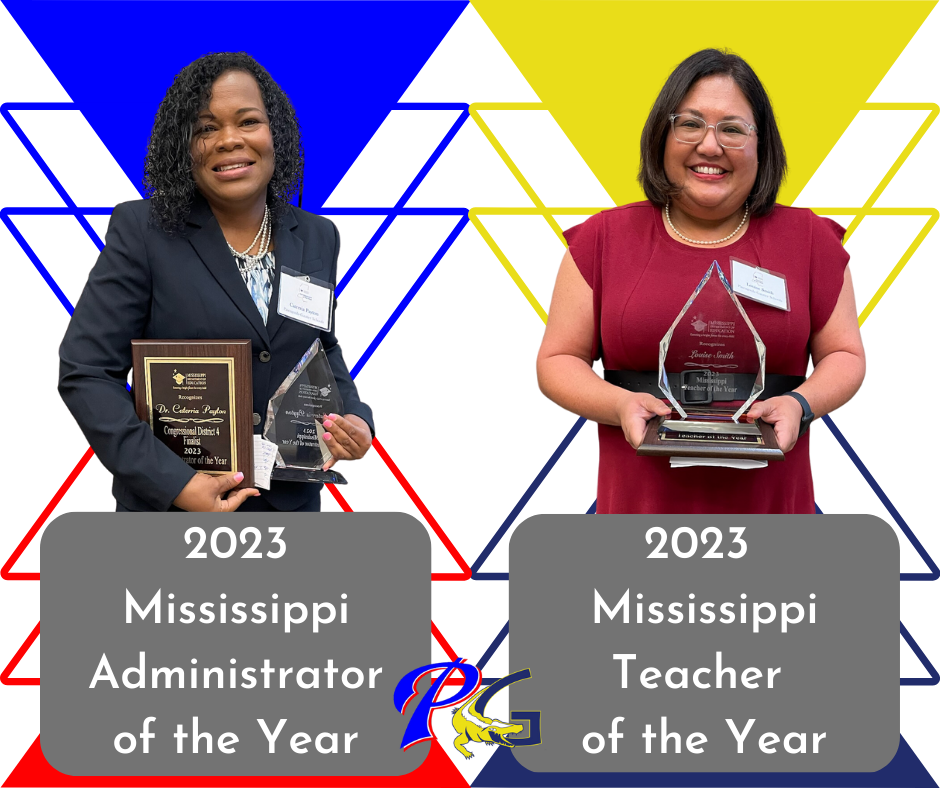 The Pascagoula-Gautier School District is excited to announce Dr. Caterria Payton, Pascagoula High School, was named the 2023 Mississippi Administrator of the Year and Ms. Louise Smith, Gautier Middle School, was named the 2023 Mississippi Teacher of the Year! We are so proud of their many accomplishments and everything they do for the students, staff, and families of PGSD.
