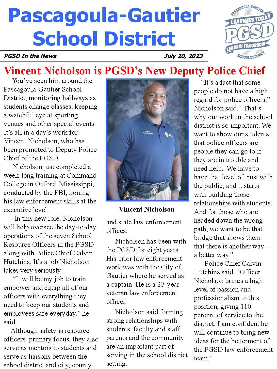 Vince Nicholson Named as PGSD's New Deputy Police Chief