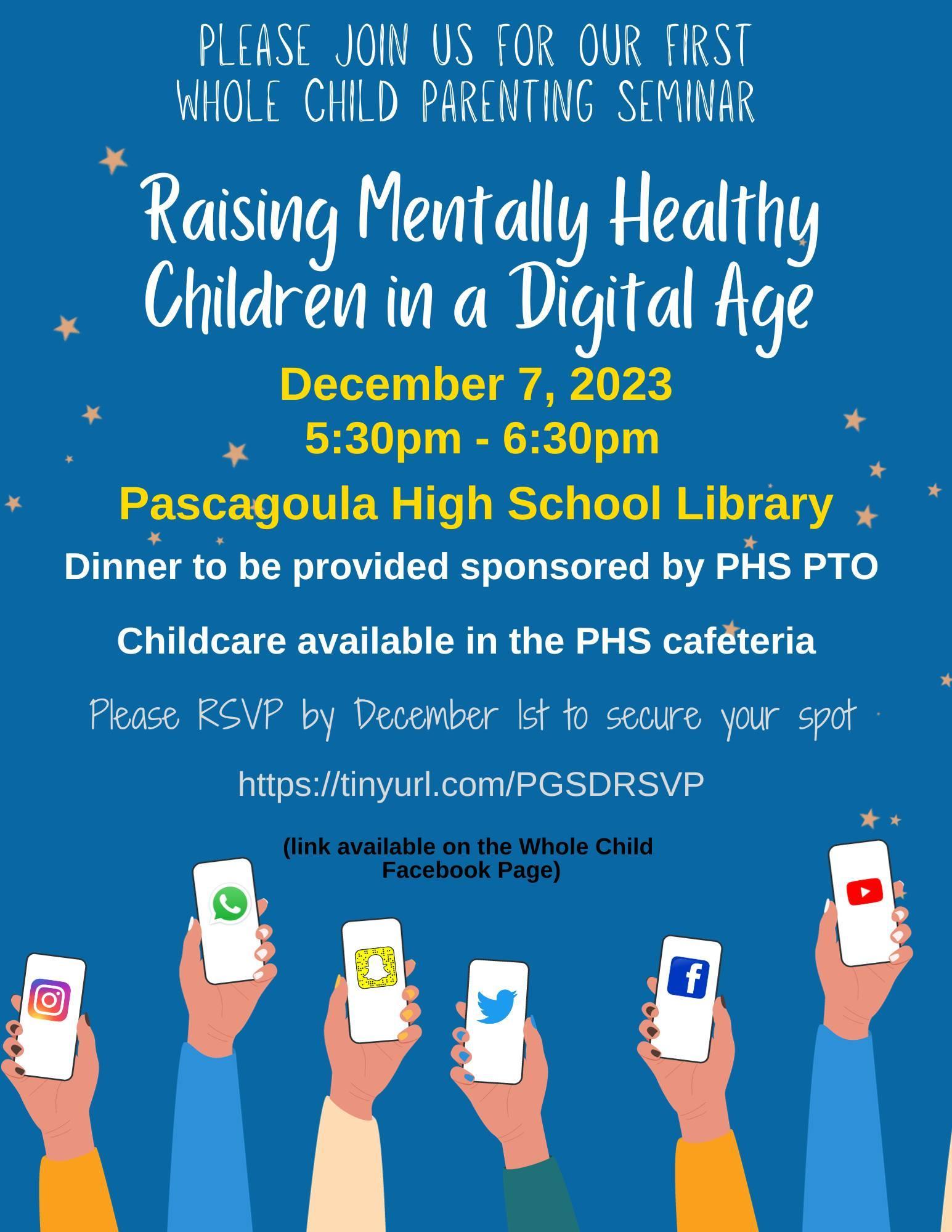 We are excited to begin a new series! We plan to have parenting seminars targeting various aspects of promoting mental health and wellness for students. Target audiences for these seminars will be parents of 5th-12th grade students. We are happy to share that Pascagoula High School will be hosting our first event.