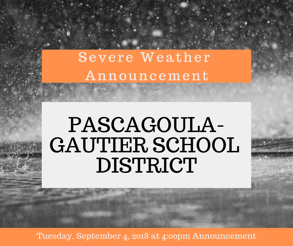 Schools will remain closed Wednesday, September 5th. Students and employees should remain home during Tropical Storm Gordon. Classes will resume Thursday, September 6th at normal times. Please continue to follow our social media, website, and phone system for further information. Thank you and please stay safe.