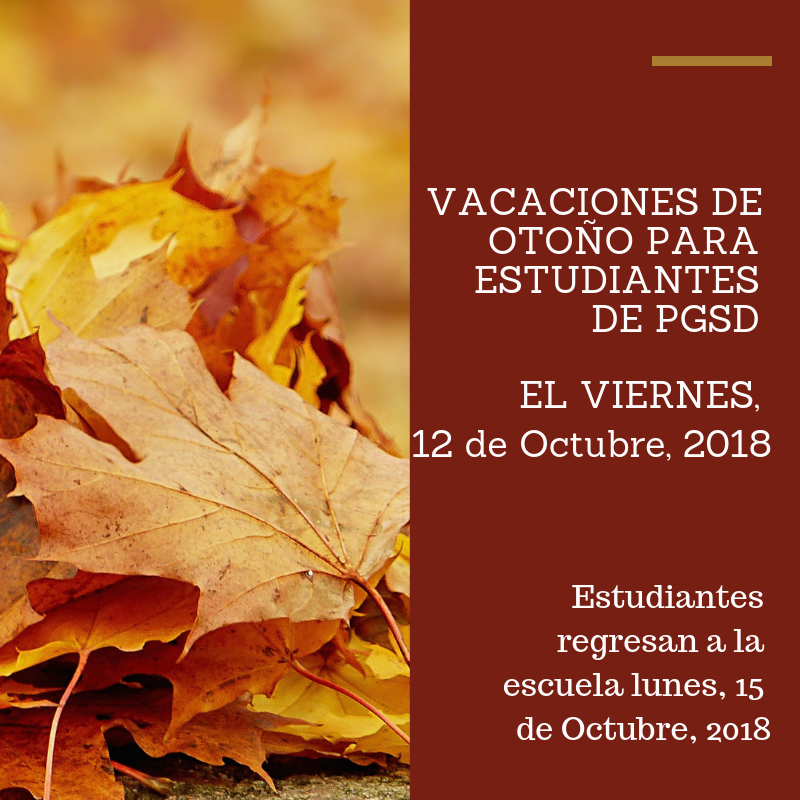 PGSD Fall Break Friday, October 12, 2018 PGSD Fall Break for Students Friday, October 12, 2018. Students return to school Monday, October 15, 2018. Vacaciones de otoño para estudiantes de PGSD el Viernes, 12 de Octubre, 2018. Estudiantes regresan a la escuela lunes, 15 de Octubre, 2018. Print
