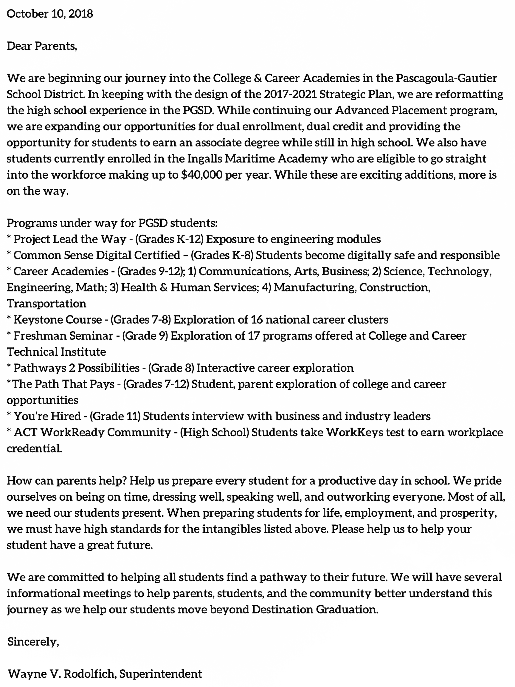 On the Move to College and Career Academies at PGSD The Pascagoula-Gautier School District is moving toward College and Career Academies. Read the letter from Superintendent, Wayne Rodolfich, to find out more. Print