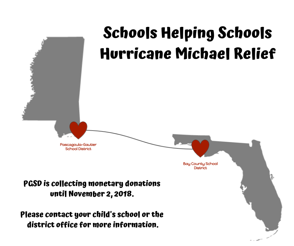 Schools in the district are collecting monetary donations until November 2, 2018. The money collected will go to the Bay County School District in Mexico Beach, FL.