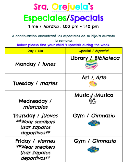 A continuación encontrará los especiales de su hijo/a durante la semana.