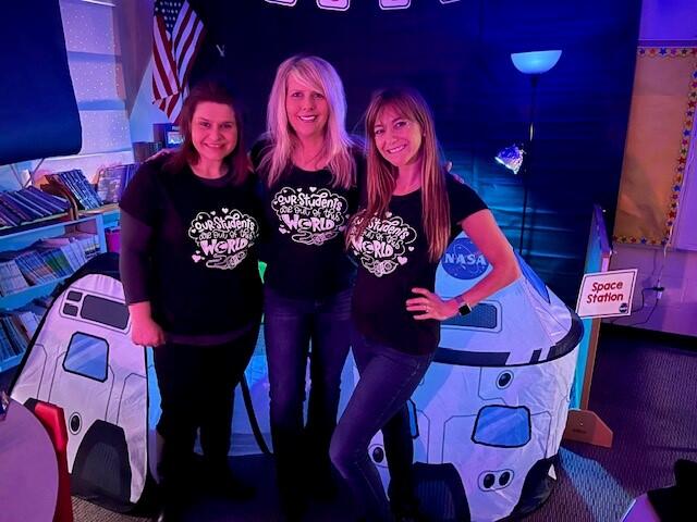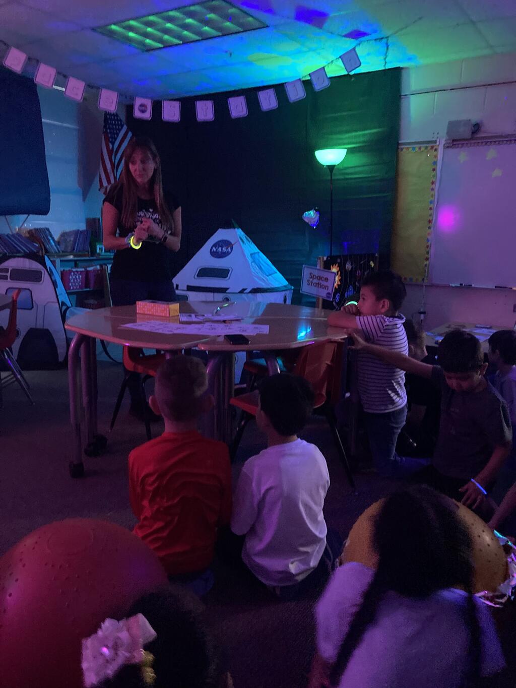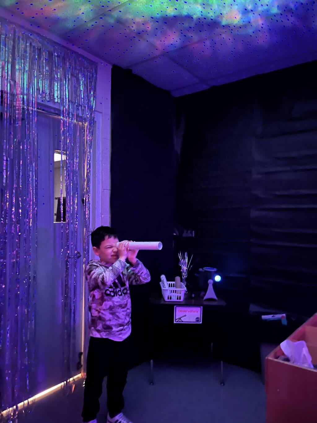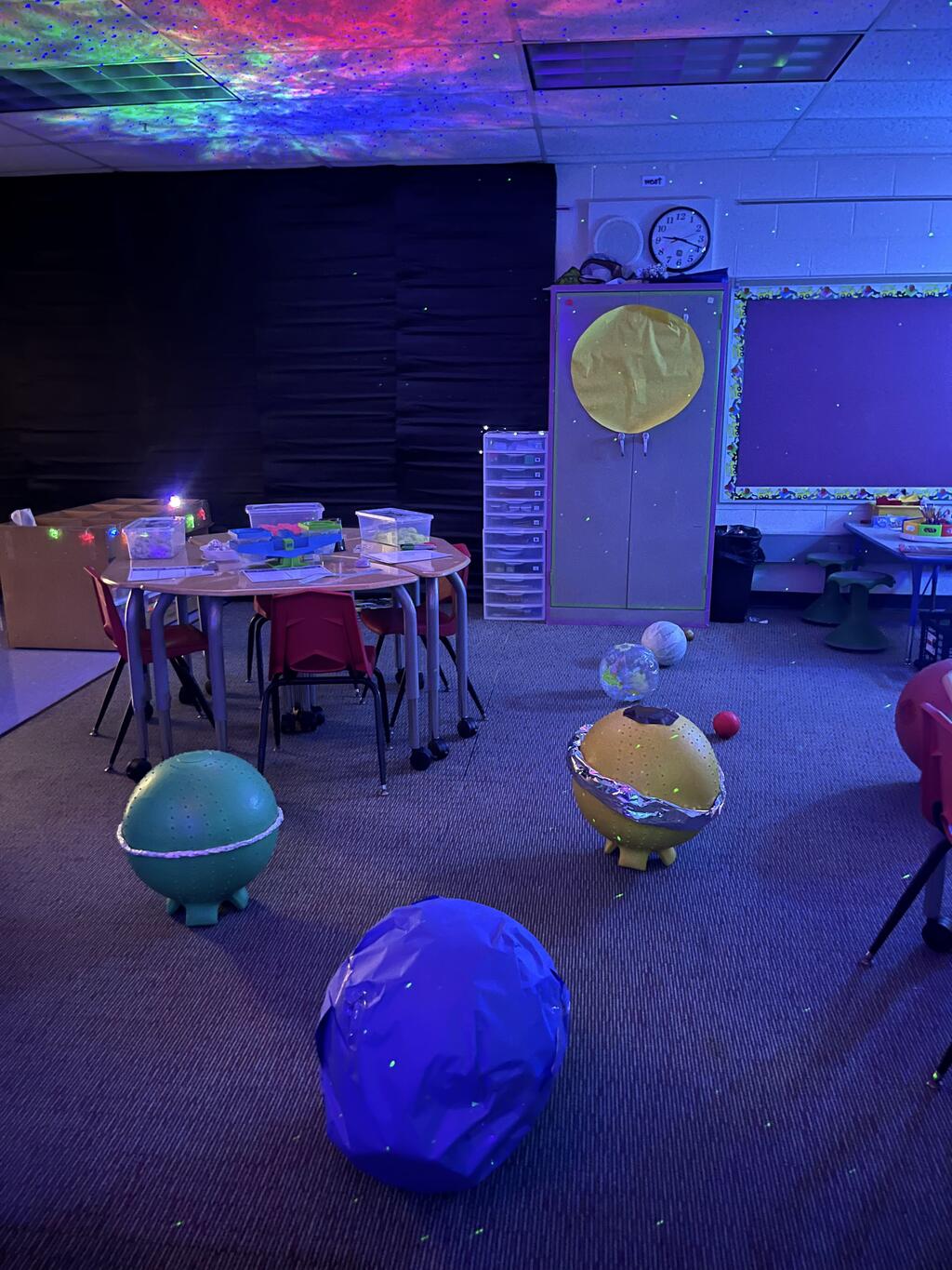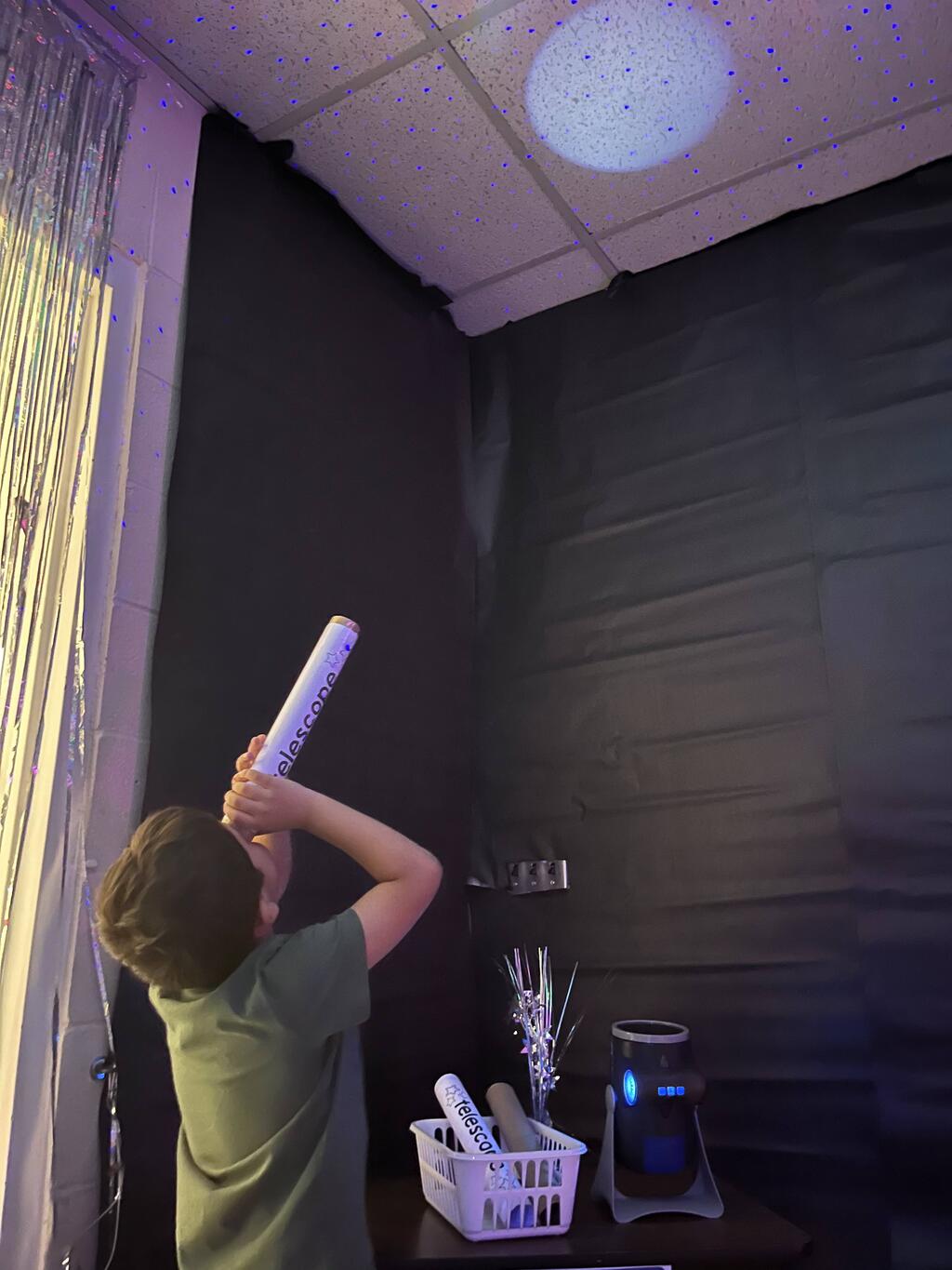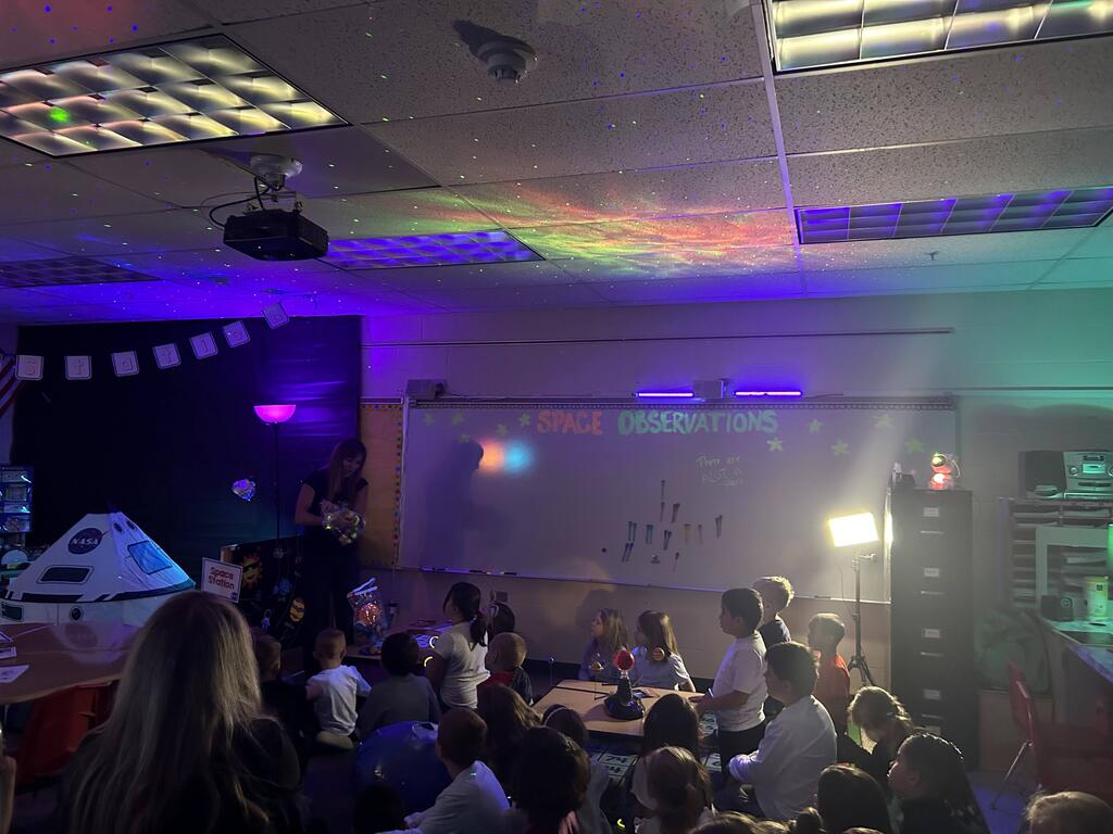 Miss Guzik's and Mrs. Keene's classes are really enjoying their unit, "Exploring the Sky"! With the help of student teacher, Kristi Bates and a high school helper, Nathan Kunsman, the Space Room was created!