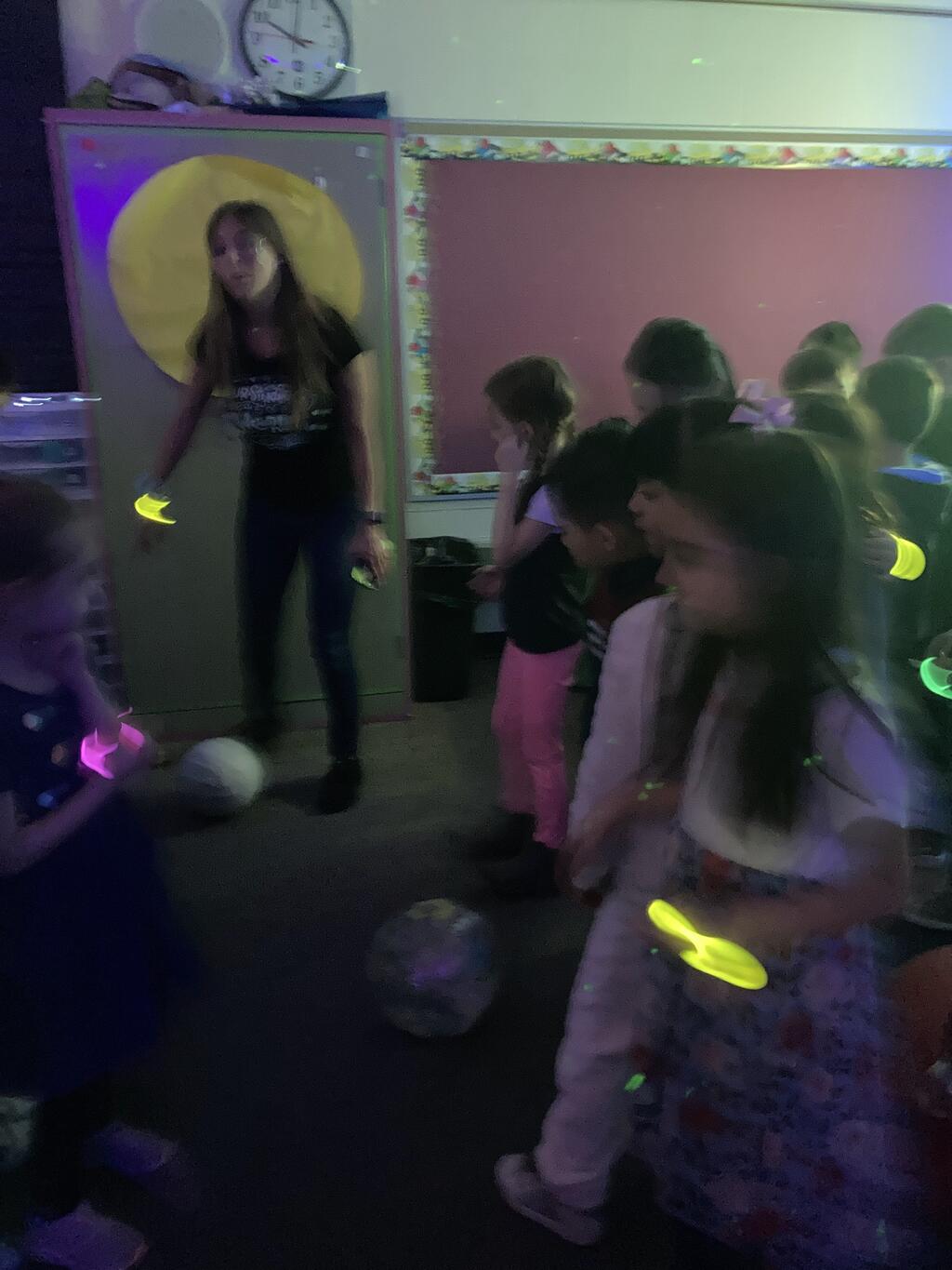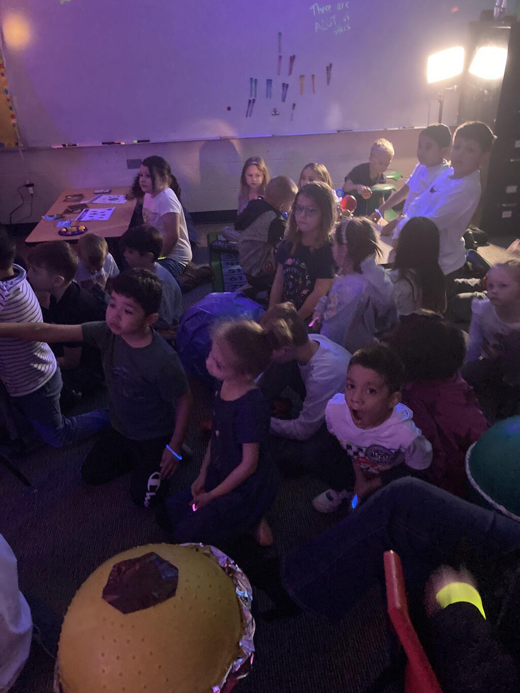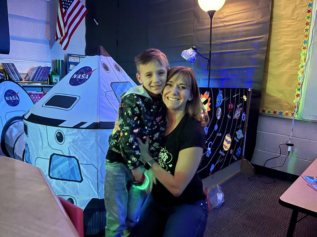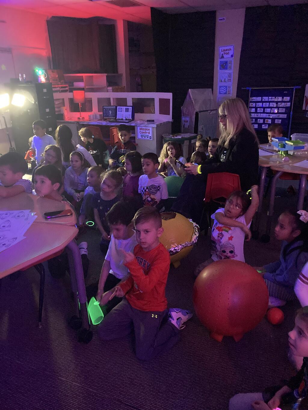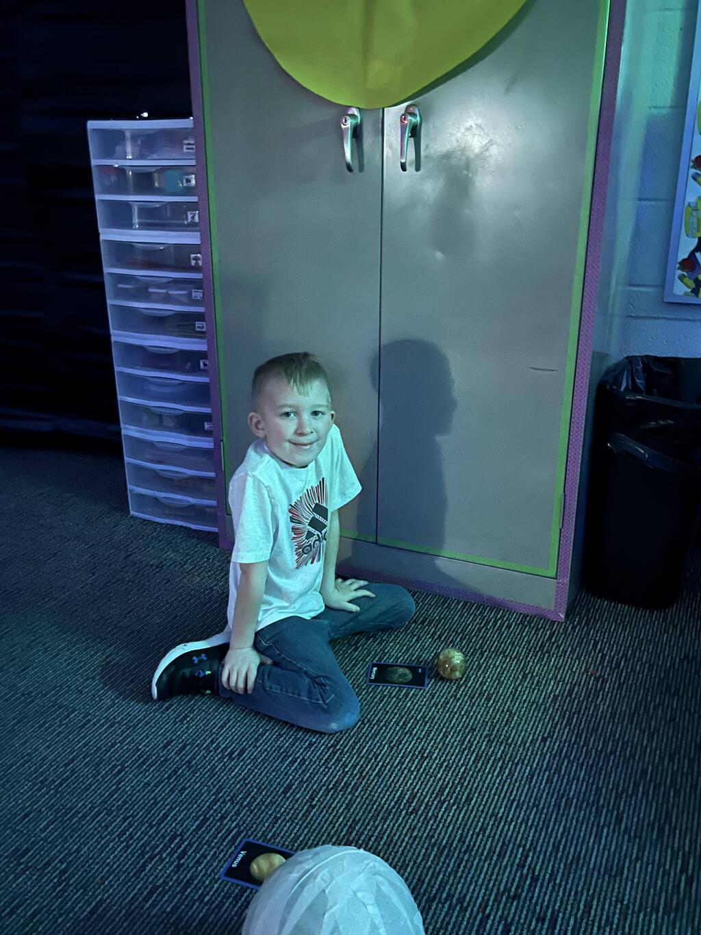 Miss Guzik's and Mrs. Keene's classes are really enjoying their unit, "Exploring the Sky"! With the help of student teacher, Kristi Bates and a high school helper, Nathan Kunsman, the Space Room was created!