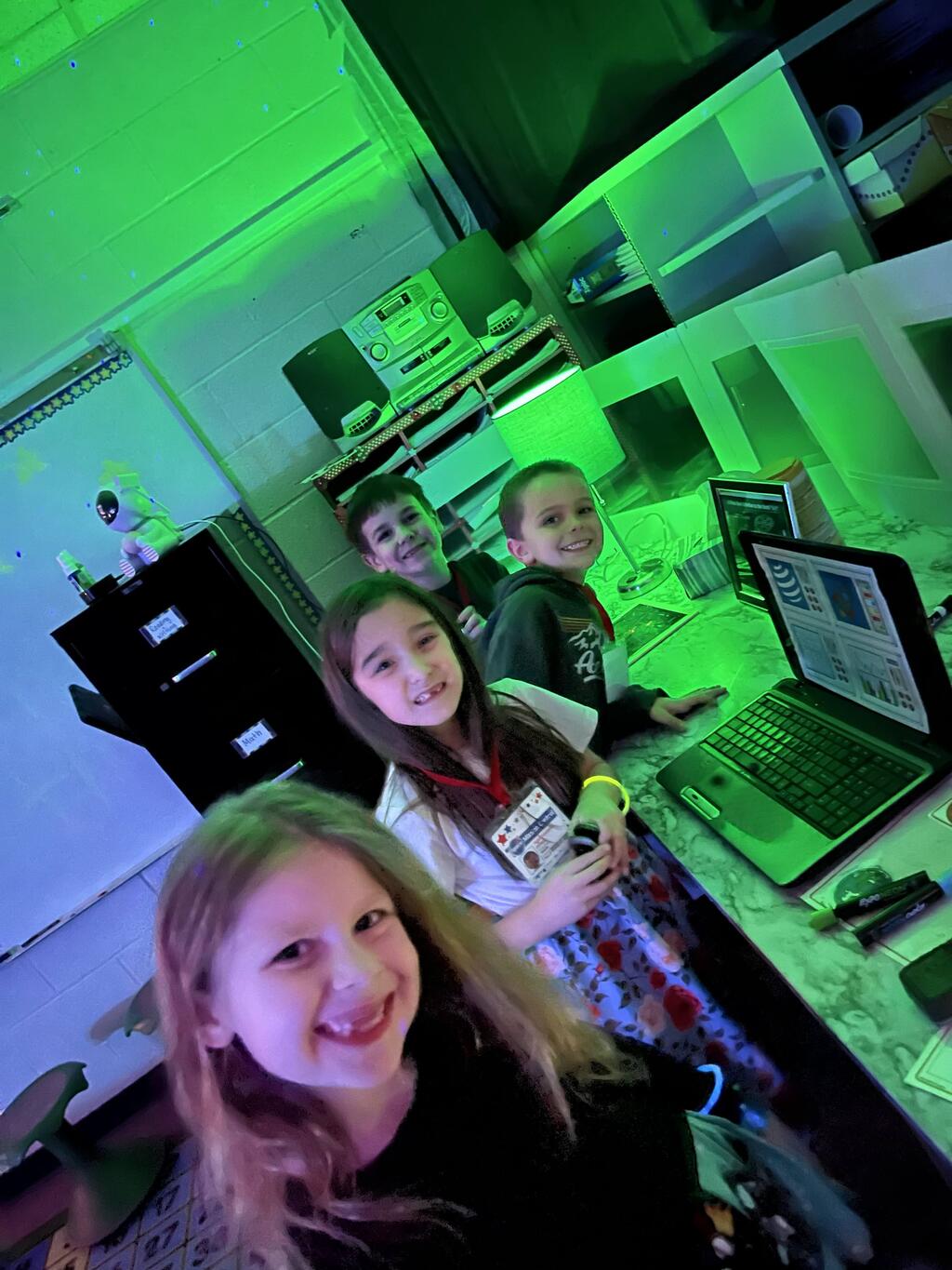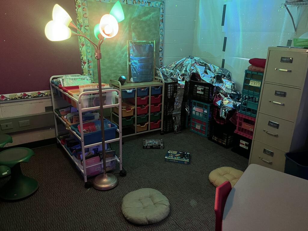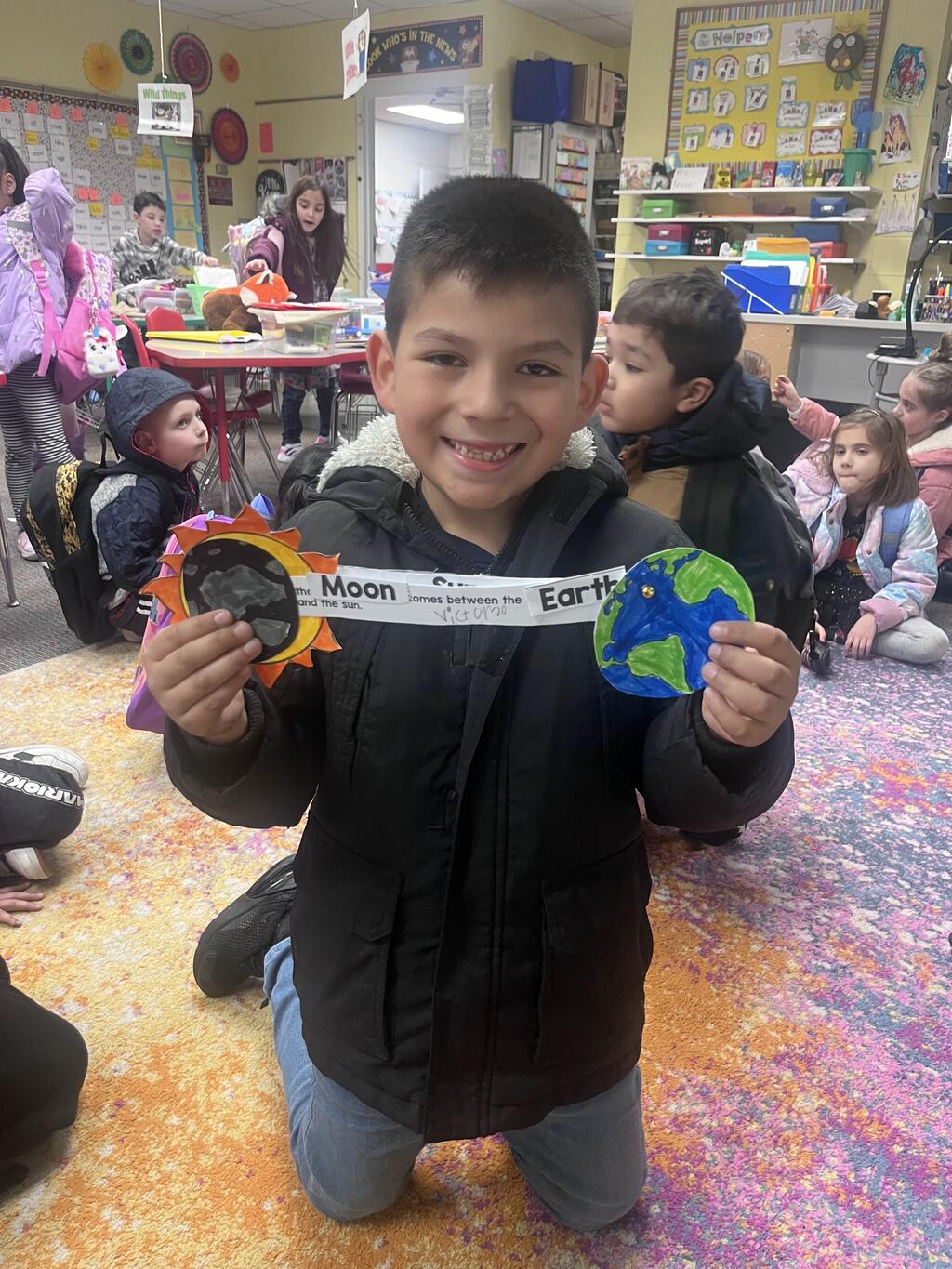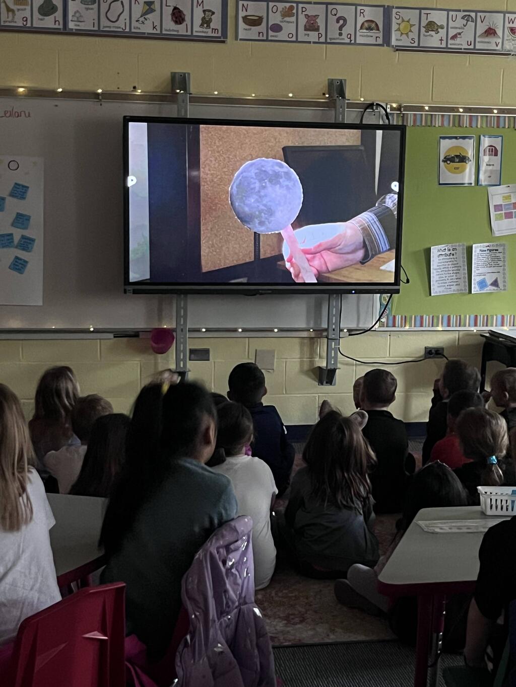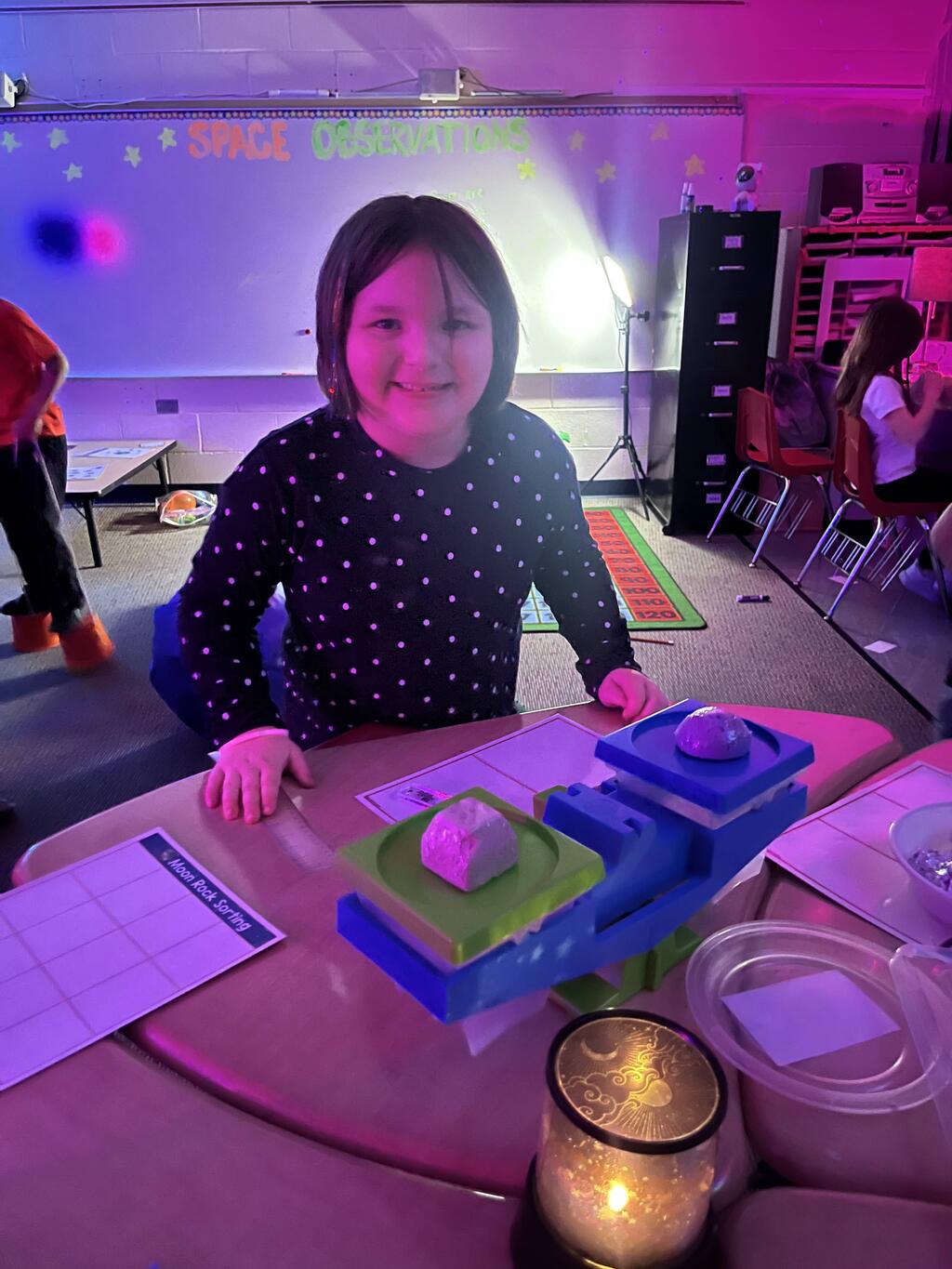 Miss Guzik's and Mrs. Keene's classes are really enjoying their unit, "Exploring the Sky"! With the help of student teacher, Kristi Bates and a high school helper, Nathan Kunsman, the Space Room was created!