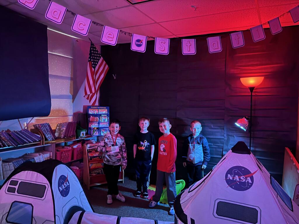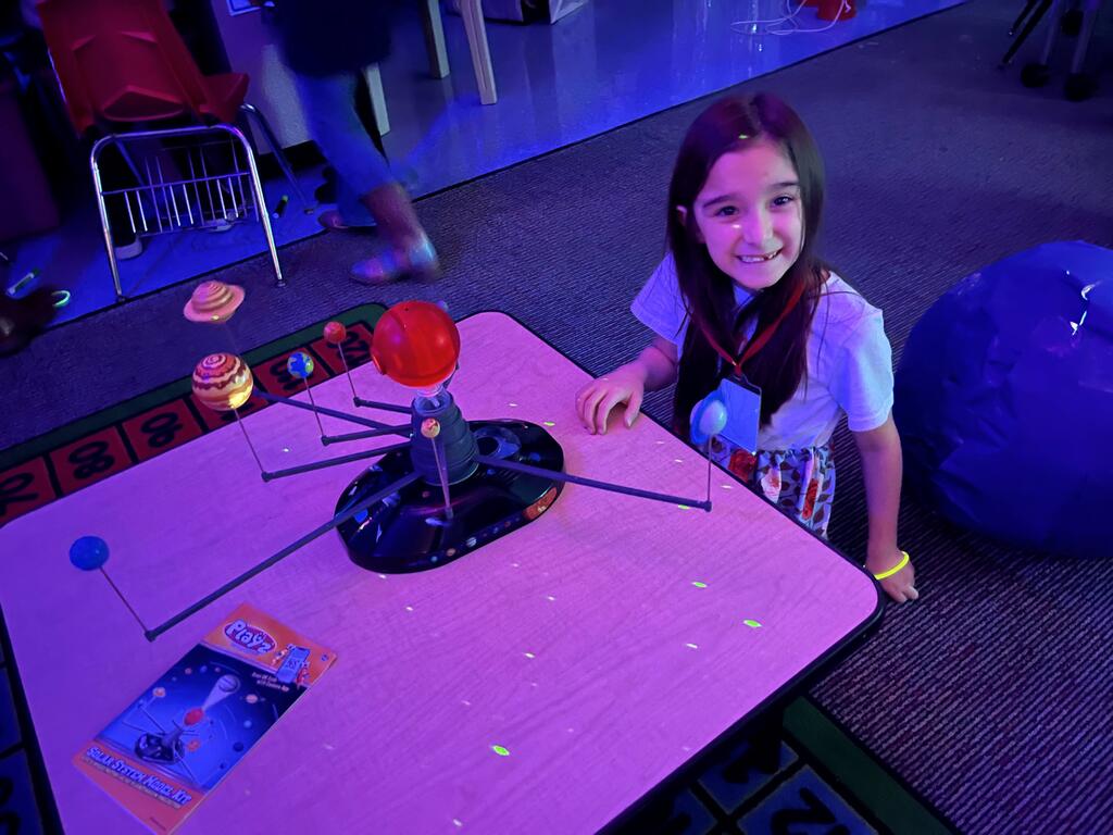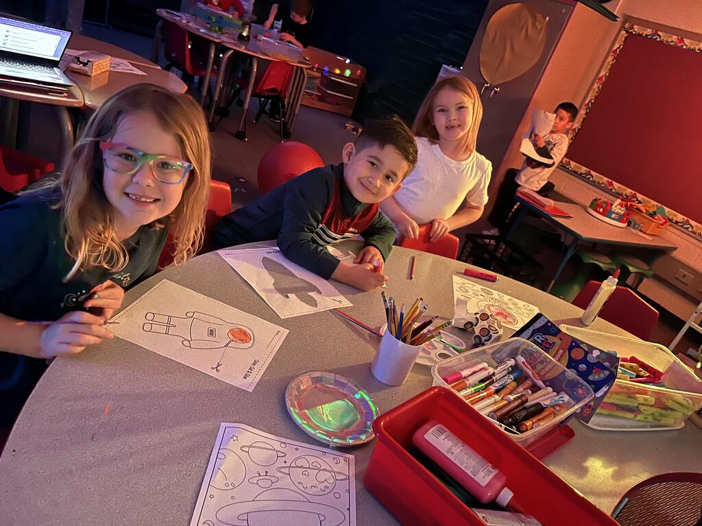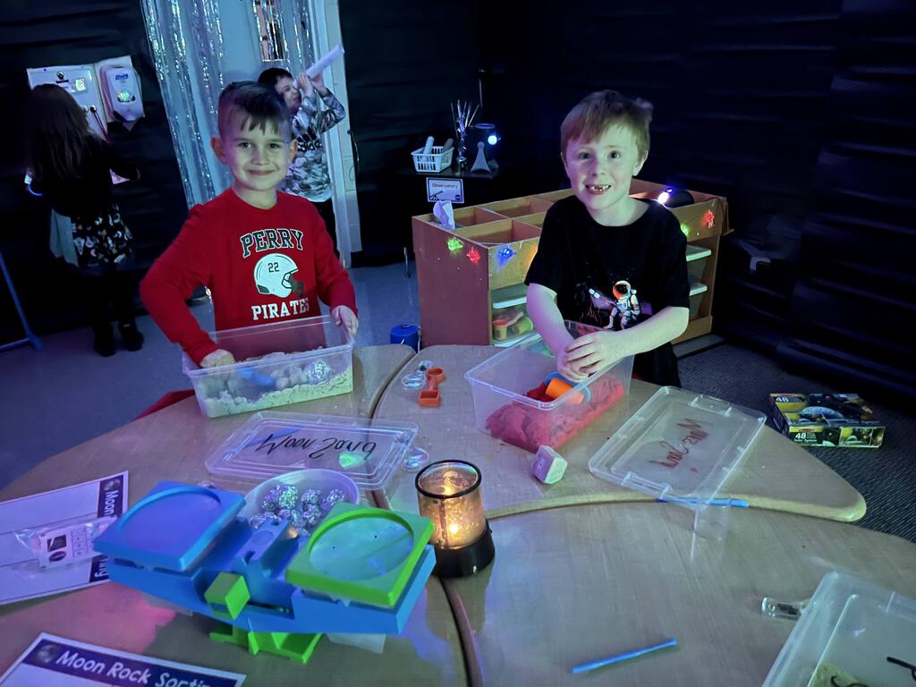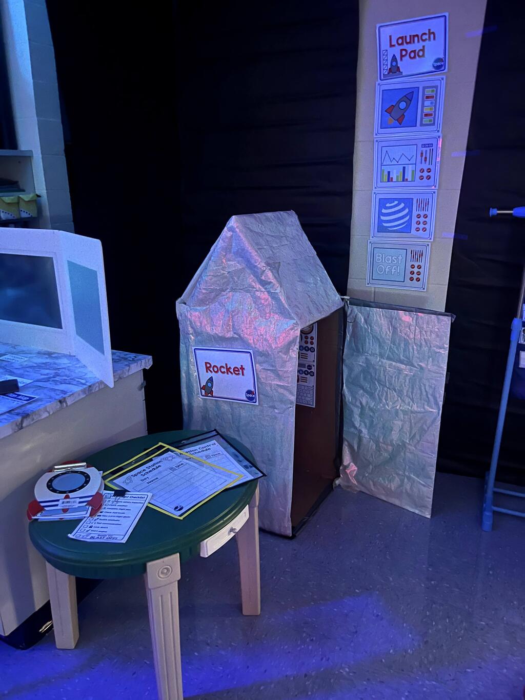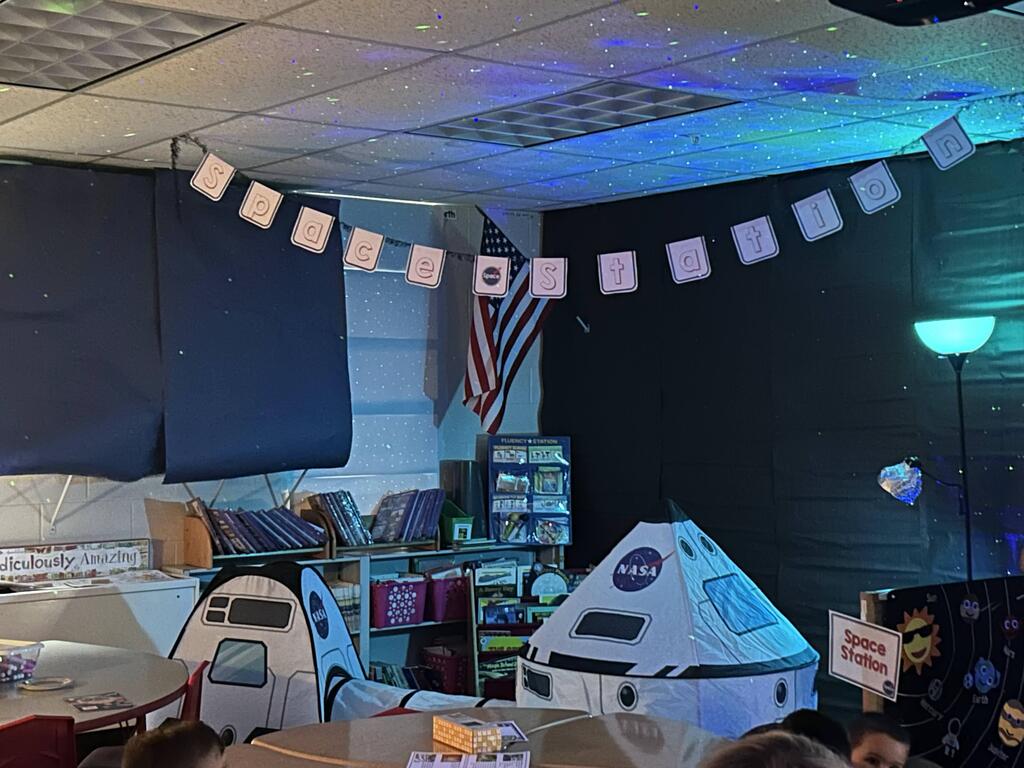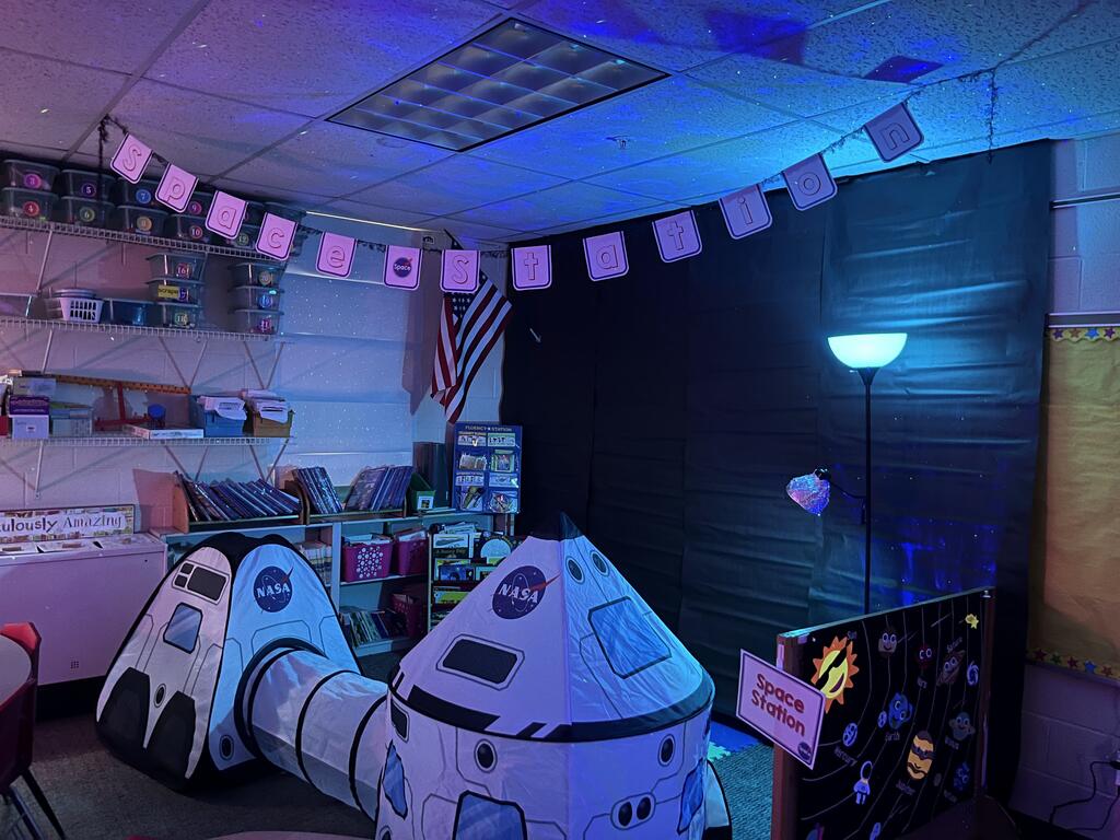 Stations in the room include an Observatory with telescopes that look at projections of planets, model planets students can travel to, the International Space Station with books about space, an Art Station, Snack Station, and of course Mission Control where students design flight plans, coordinate rocket schedules, run computers, and blast into space!