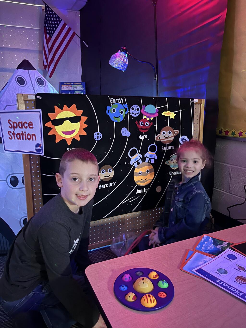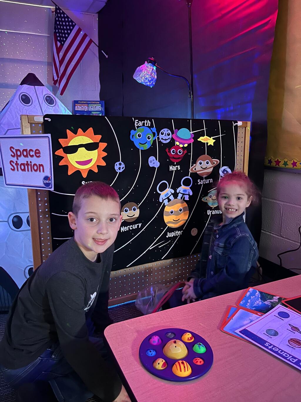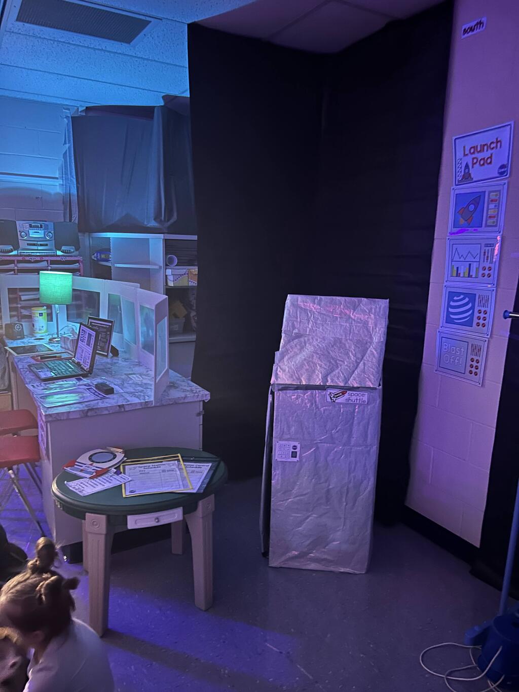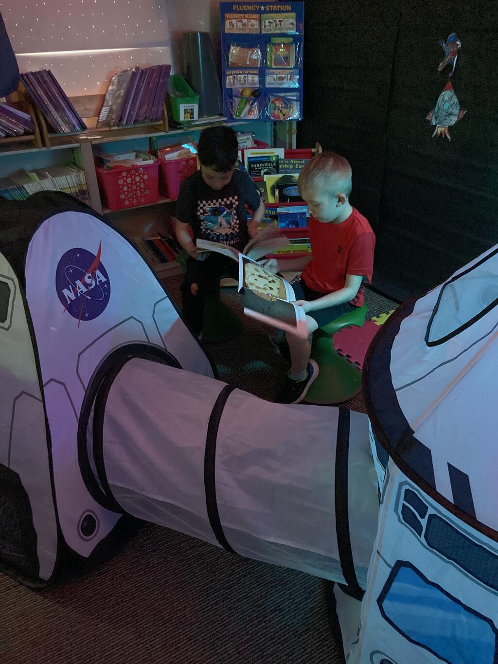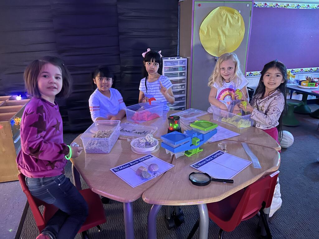 Stations in the room include an Observatory with telescopes that look at projections of planets, model planets students can travel to, the International Space Station with books about space, an Art Station, Snack Station, and of course Mission Control where students design flight plans, coordinate rocket schedules, run computers, and blast into space!