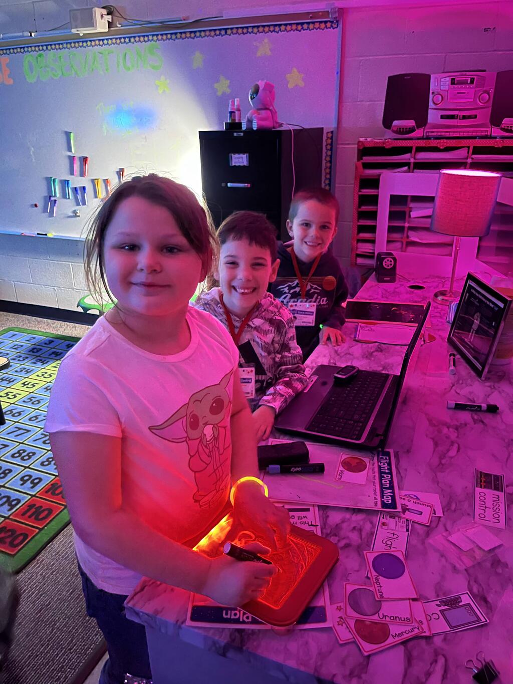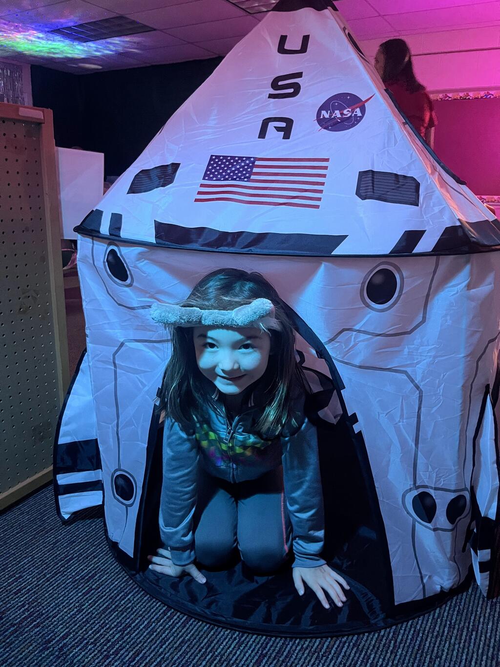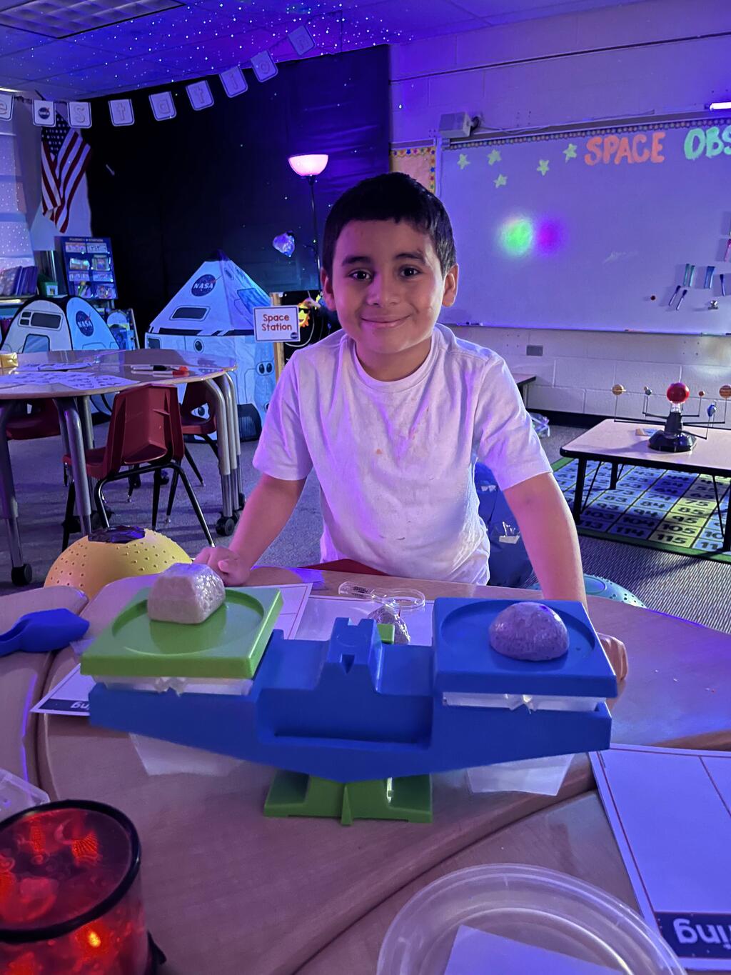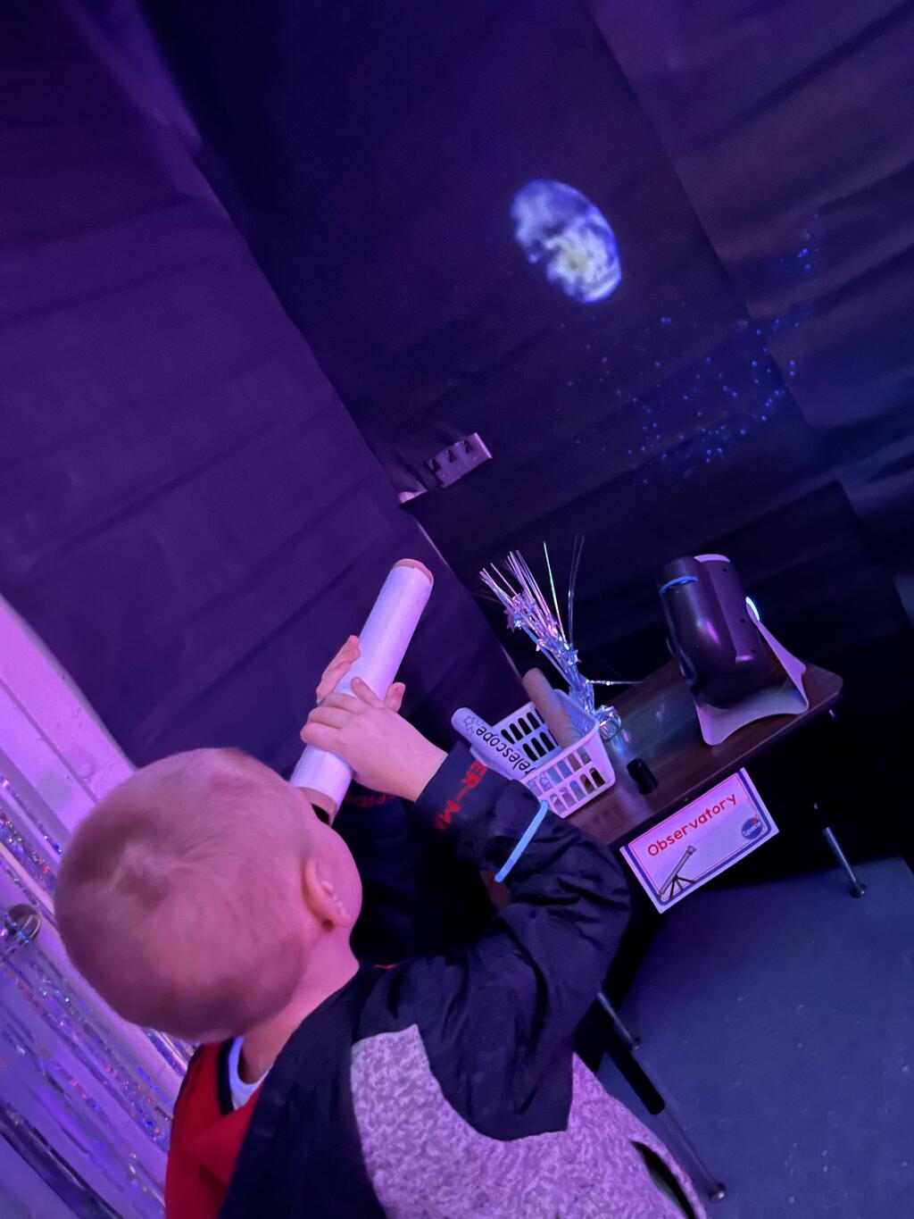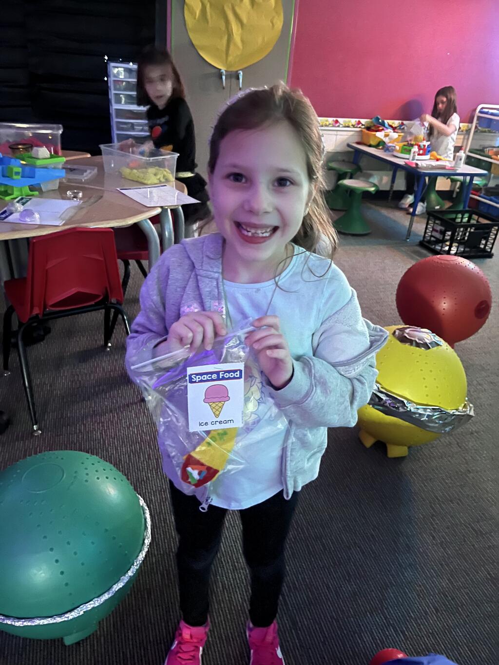 Stations in the room include an Observatory with telescopes that look at projections of planets, model planets students can travel to, the International Space Station with books about space, an Art Station, Snack Station, and of course Mission Control where students design flight plans, coordinate rocket schedules, run computers, and blast into space!
