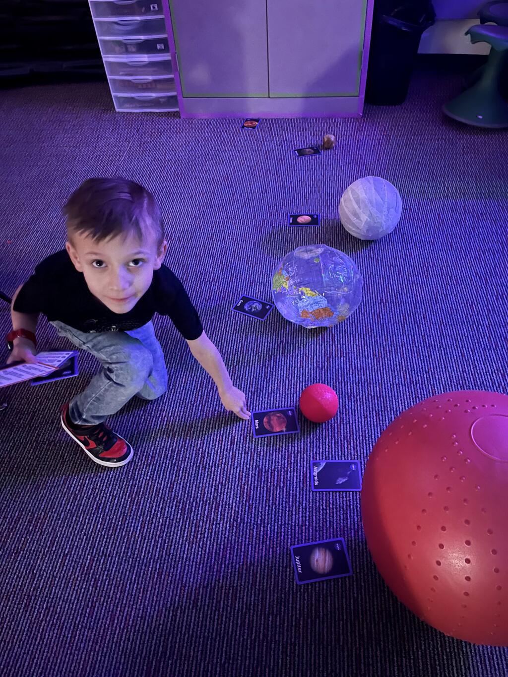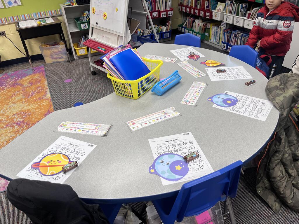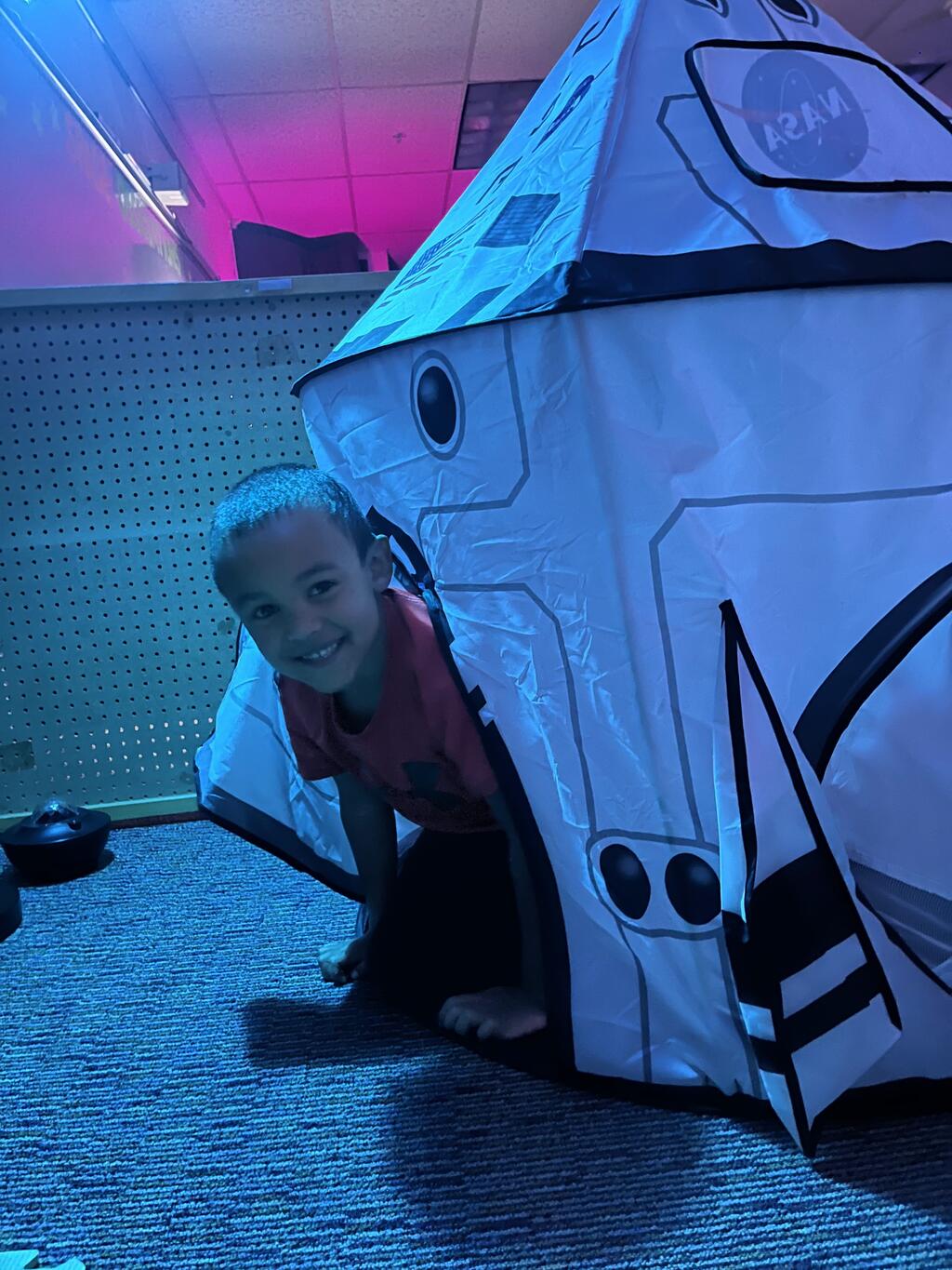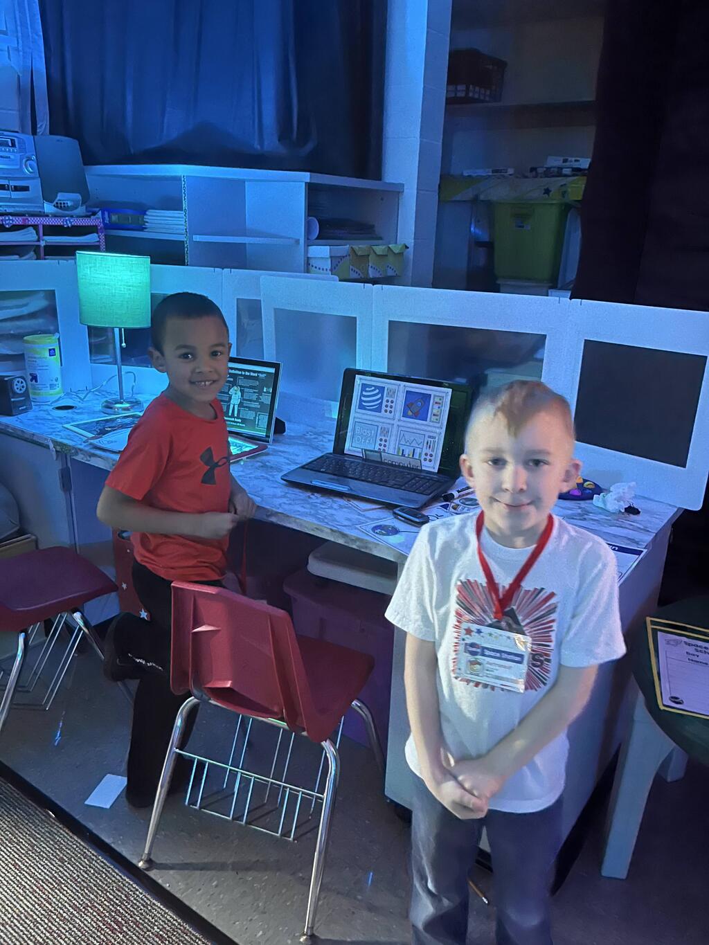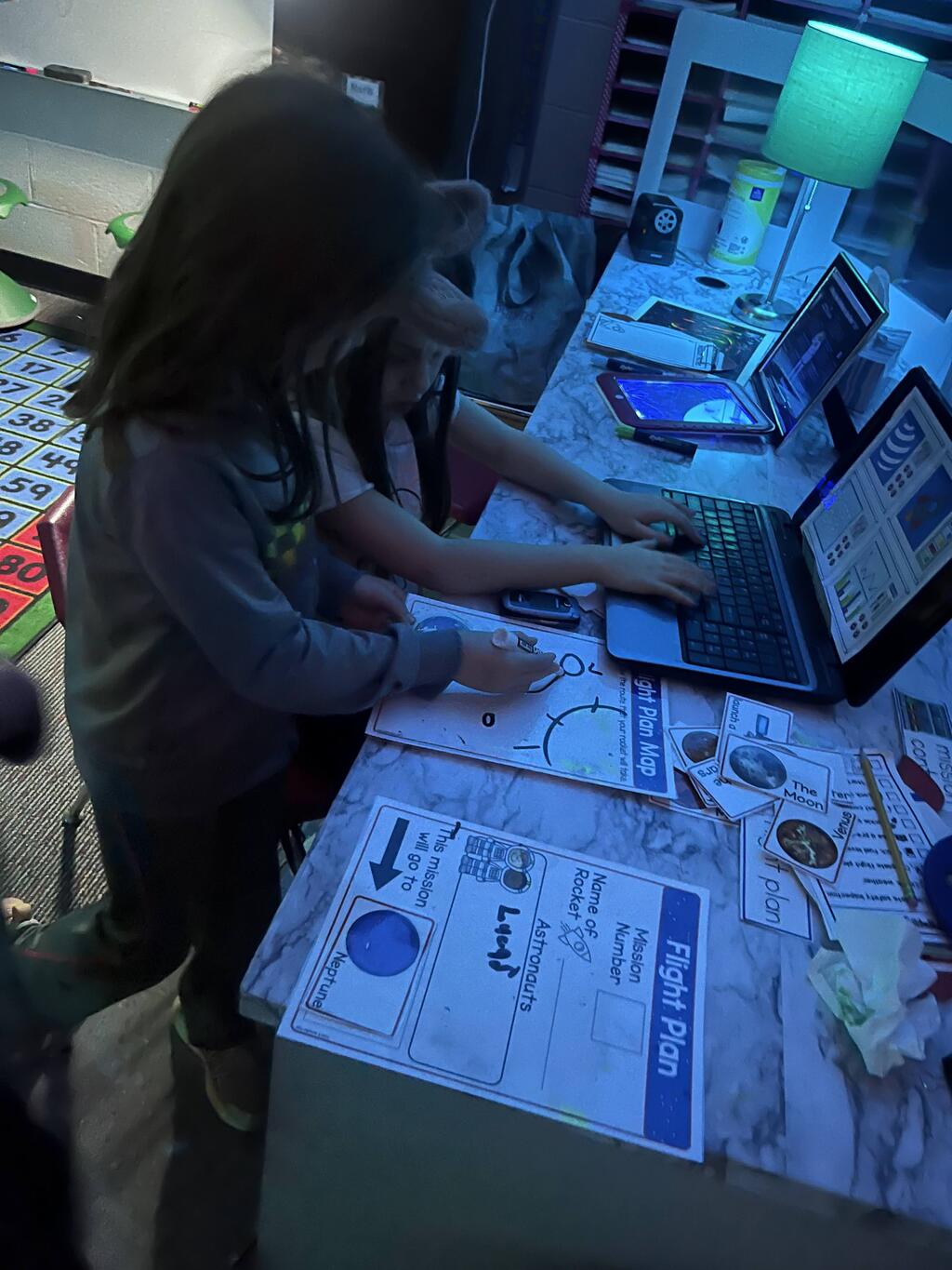 Stations in the room include an Observatory with telescopes that look at projections of planets, model planets students can travel to, the International Space Station with books about space, an Art Station, Snack Station, and of course Mission Control where students design flight plans, coordinate rocket schedules, run computers, and blast into space!