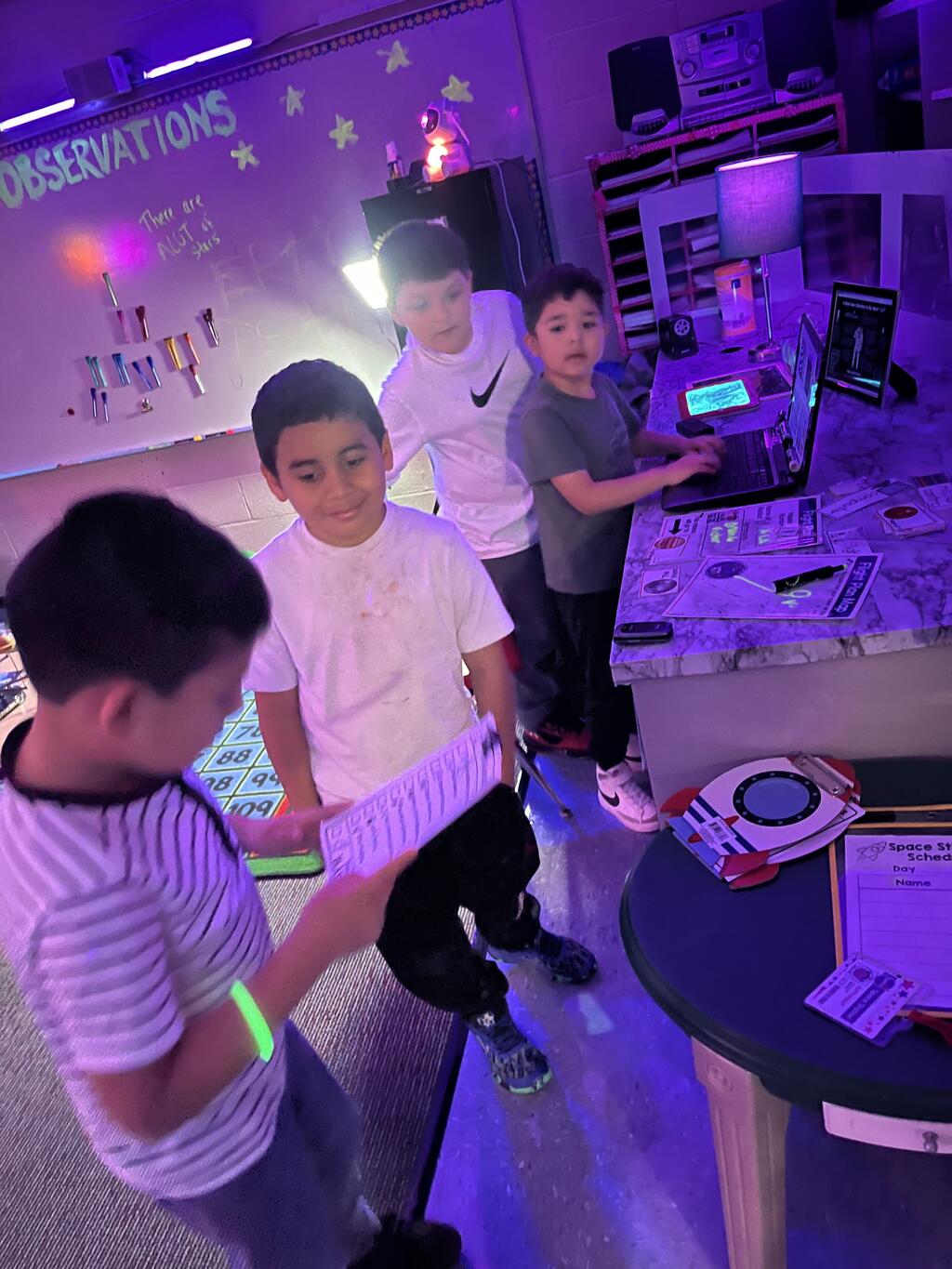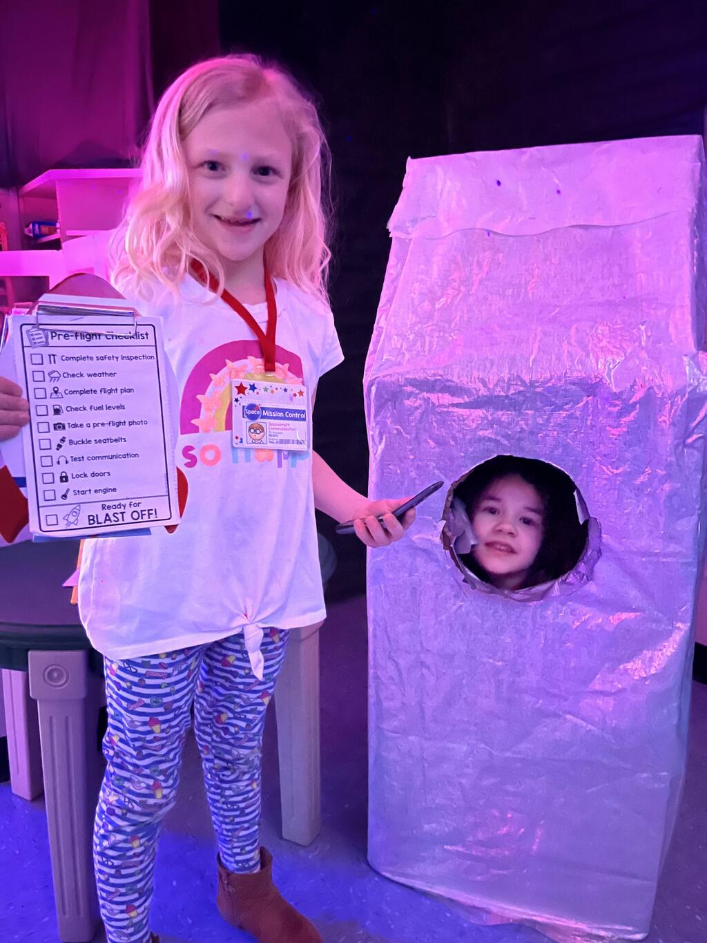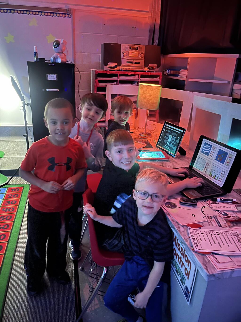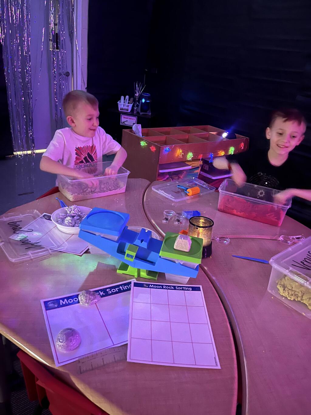 Stations in the room include an Observatory with telescopes that look at projections of planets, model planets students can travel to, the International Space Station with books about space, an Art Station, Snack Station, and of course Mission Control where students design flight plans, coordinate rocket schedules, run computers, and blast into space!