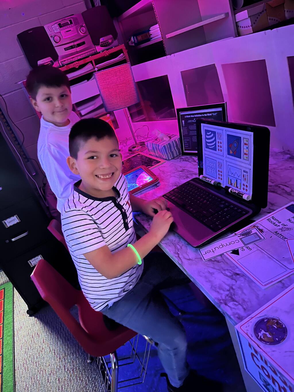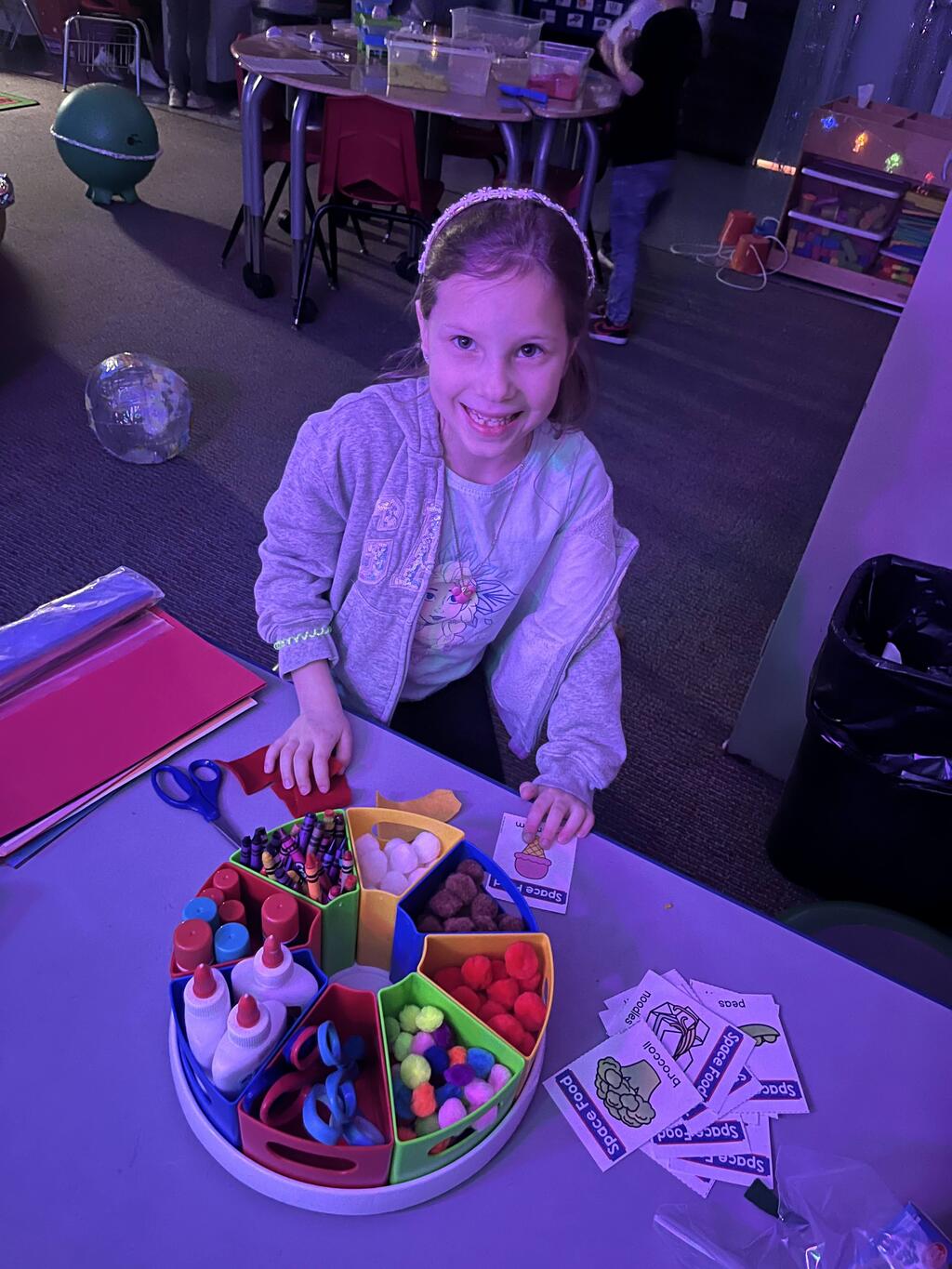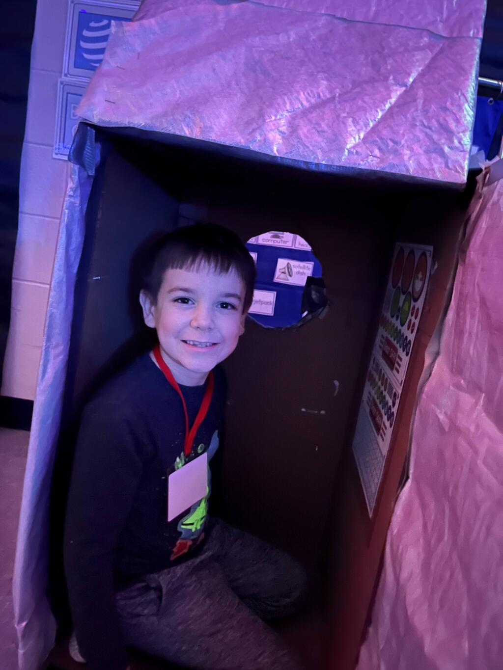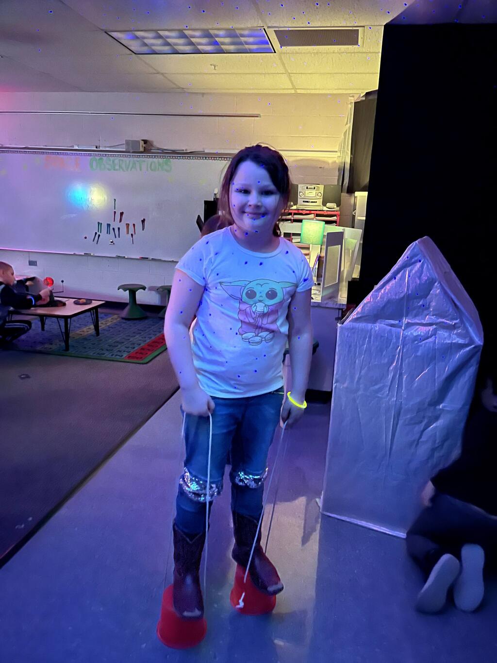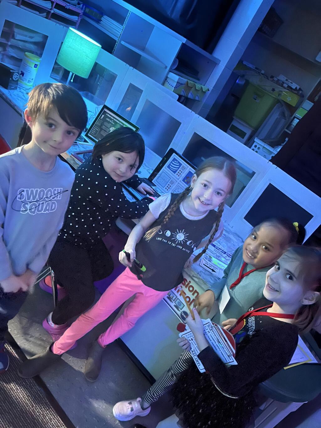 Stations in the room include an Observatory with telescopes that look at projections of planets, model planets students can travel to, the International Space Station with books about space, an Art Station, Snack Station, and of course Mission Control where students design flight plans, coordinate rocket schedules, run computers, and blast into space!