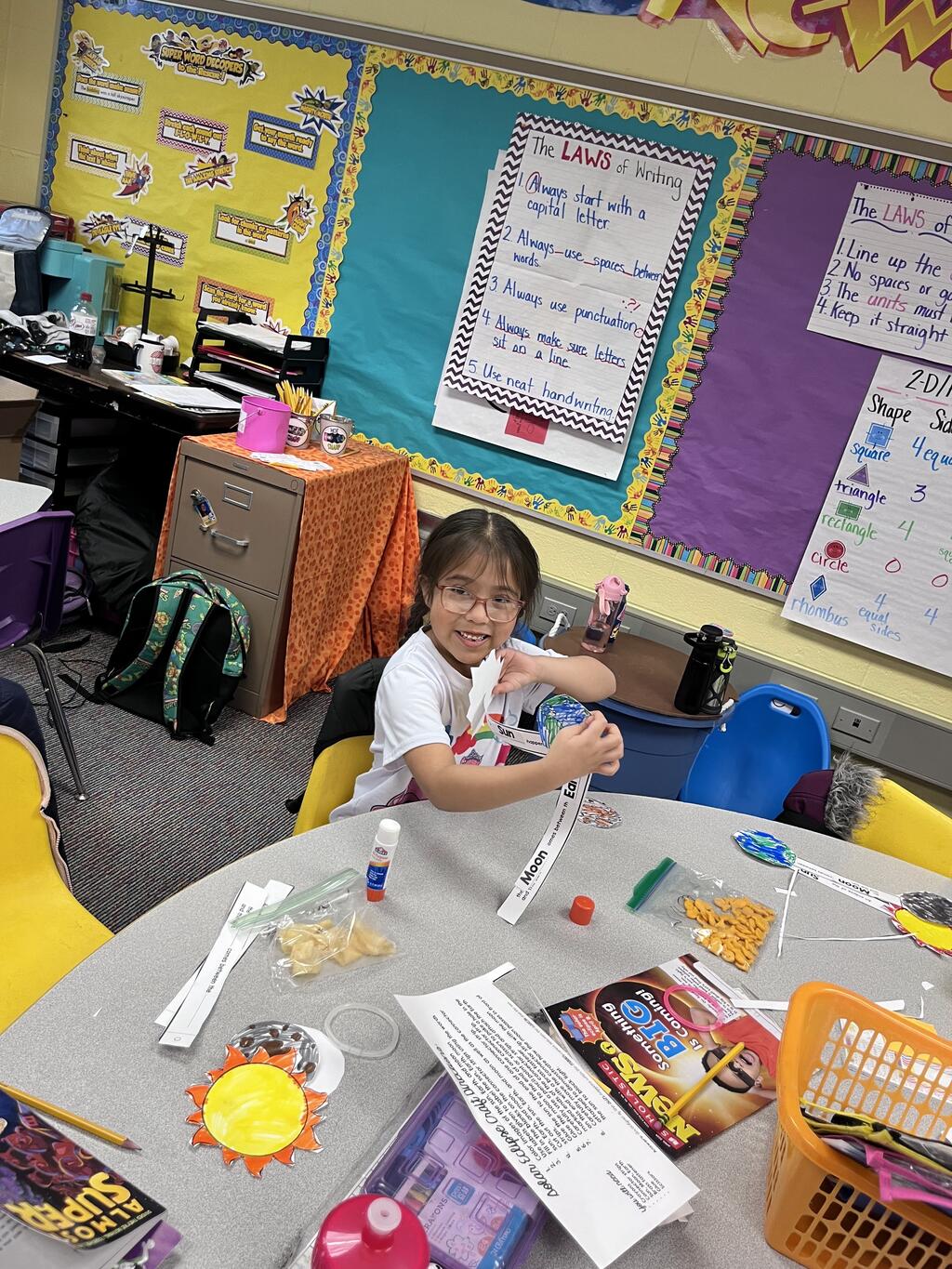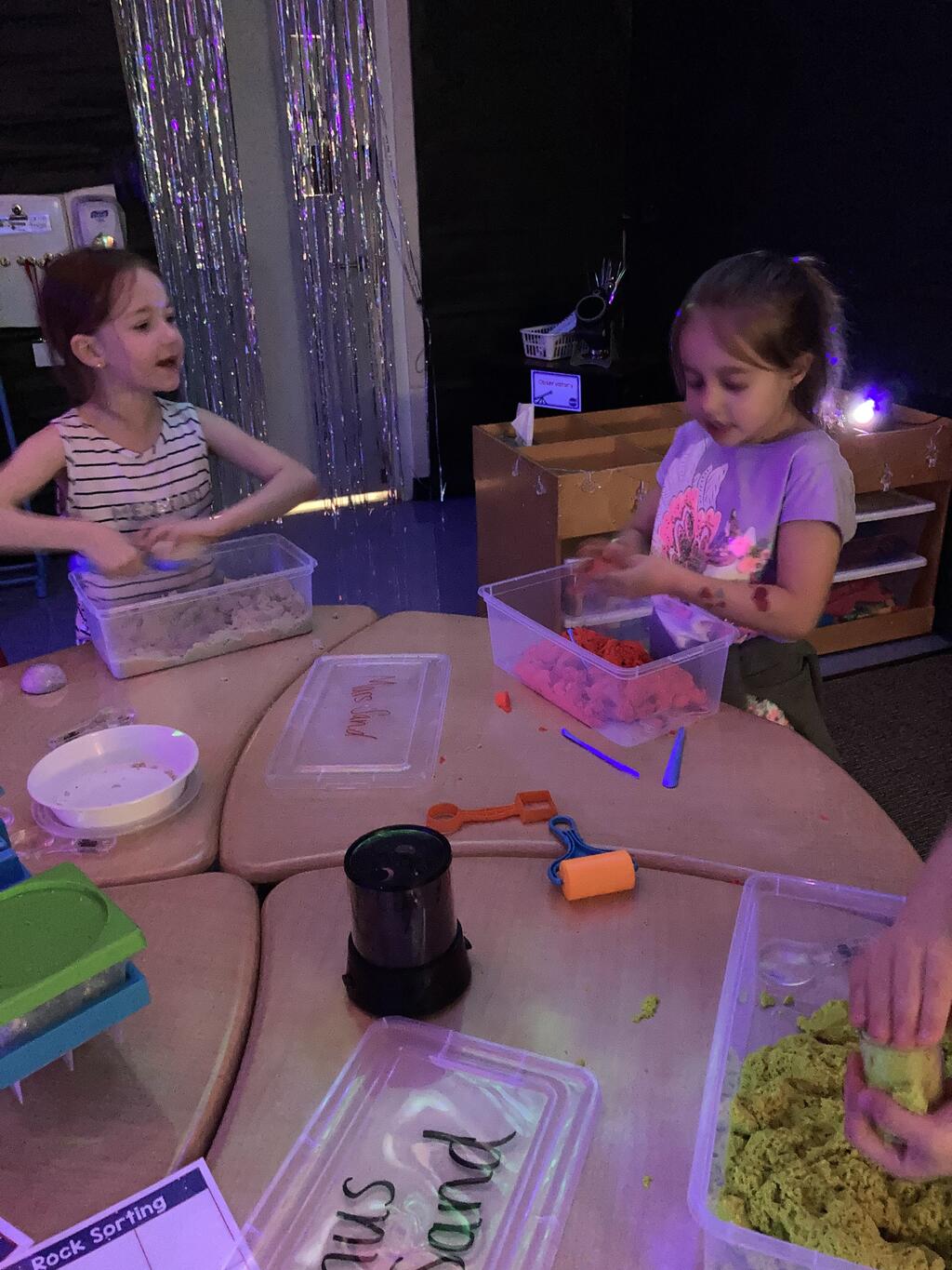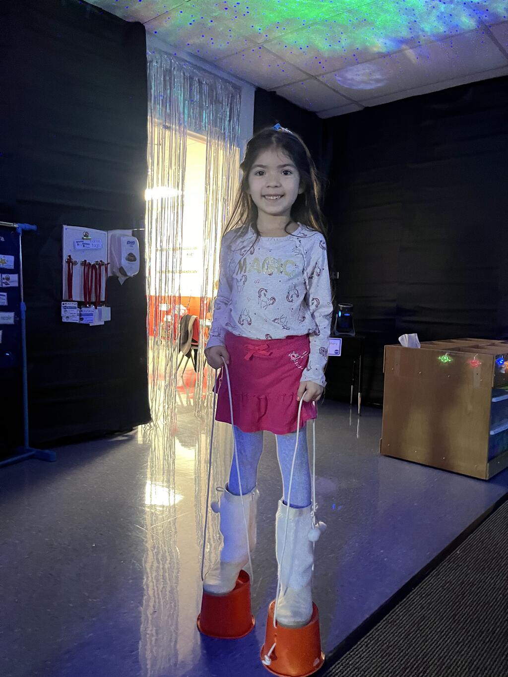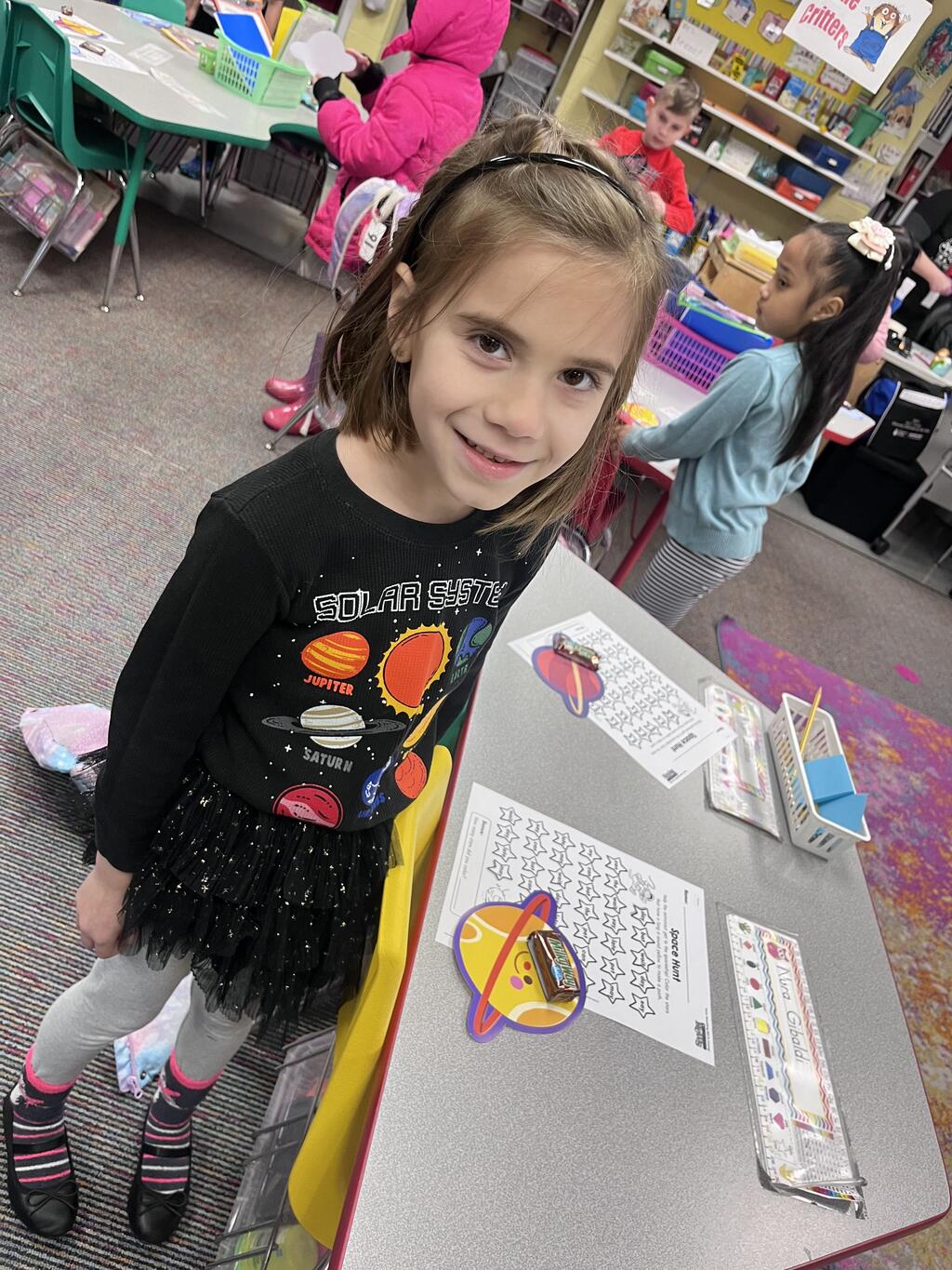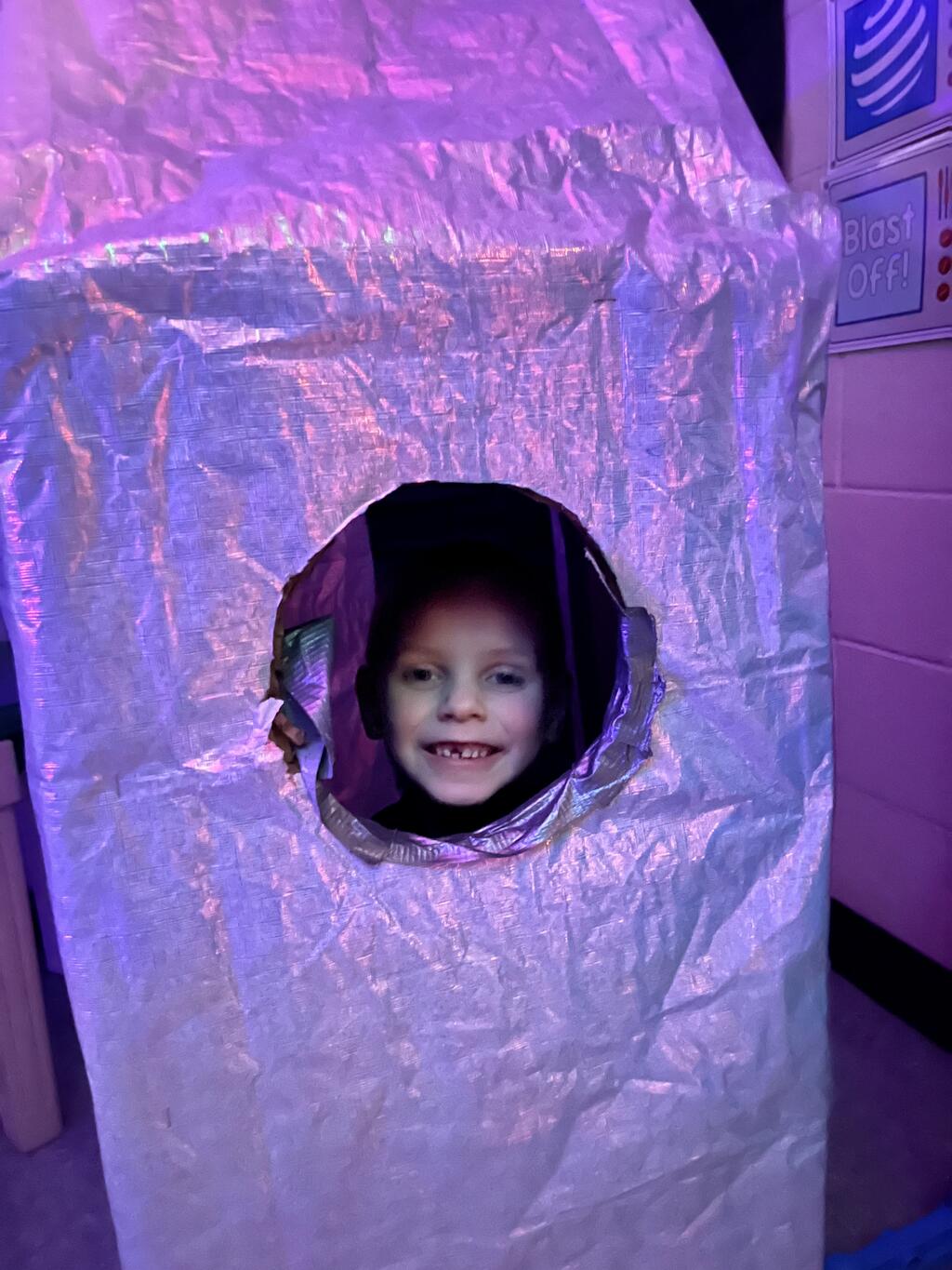 Stations in the room include an Observatory with telescopes that look at projections of planets, model planets students can travel to, the International Space Station with books about space, an Art Station, Snack Station, and of course Mission Control where students design flight plans, coordinate rocket schedules, run computers, and blast into space!