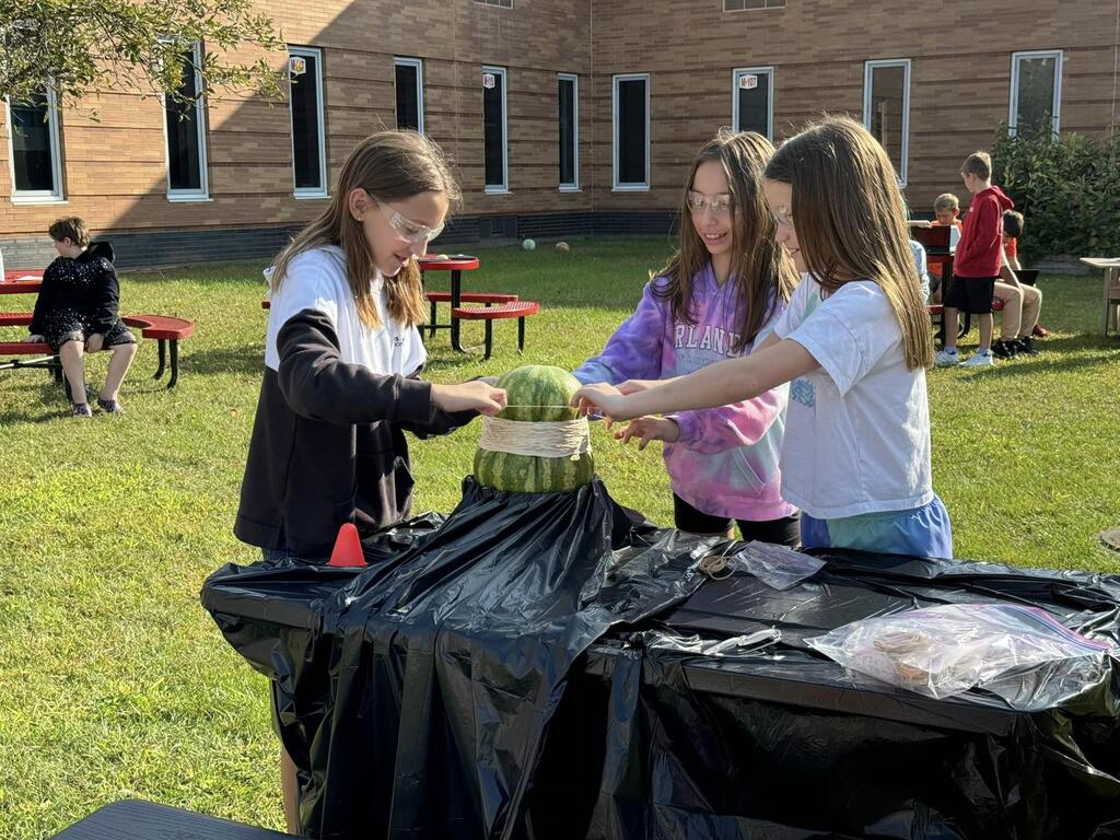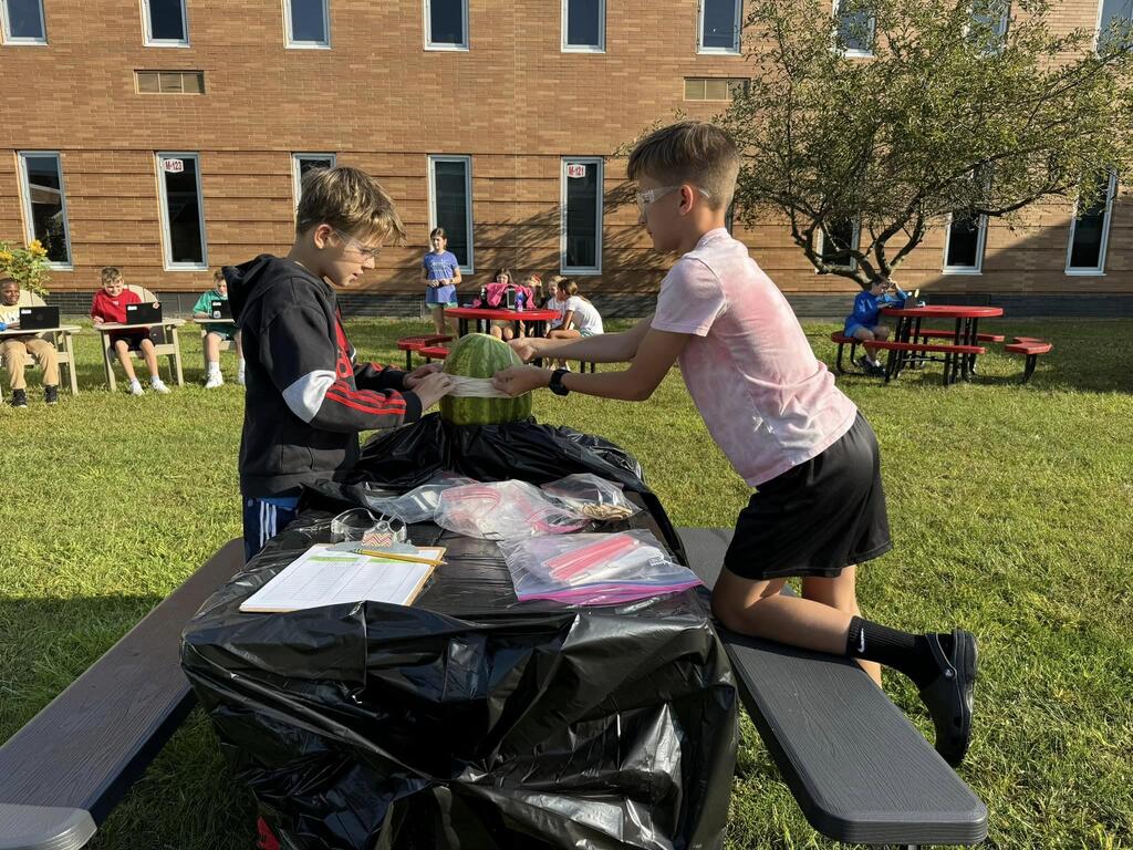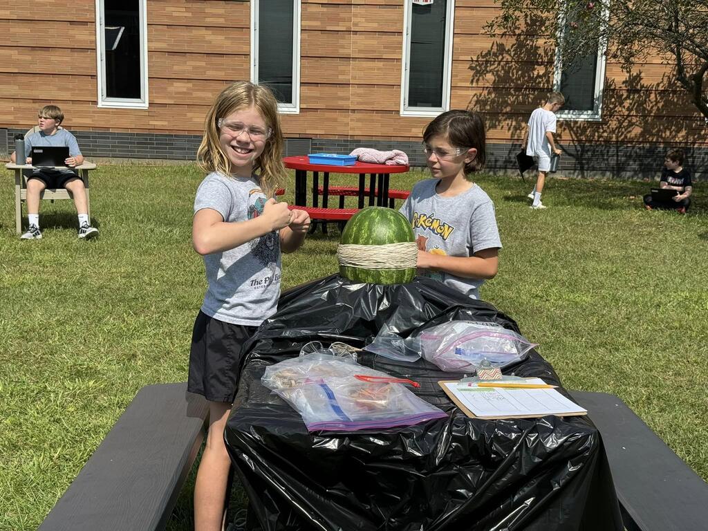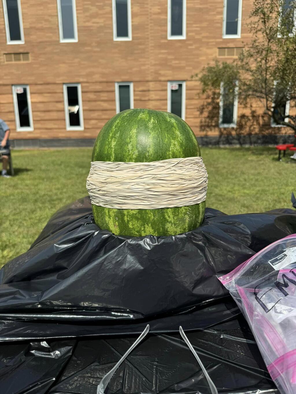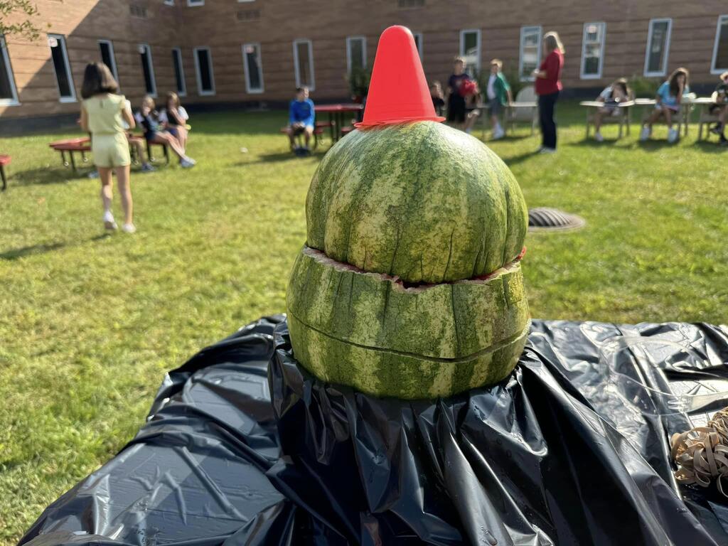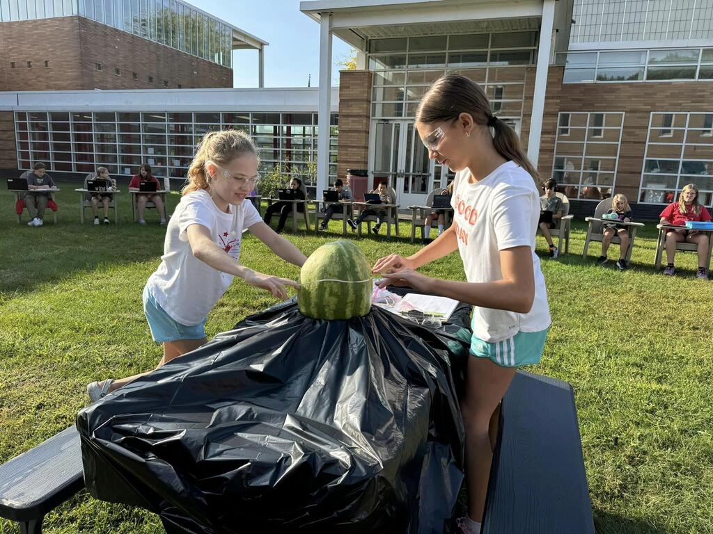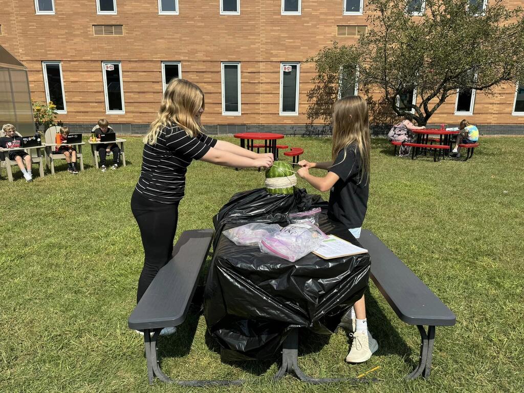 Students used the Scientific Method to determine how many rubber bands would be needed to make a watermelon burst. The morning science class watermelon had a lack-luster explosion after only 220 rubber bands but the afternoon class needed two days and 610 rubber bands for a much more exciting explosion!