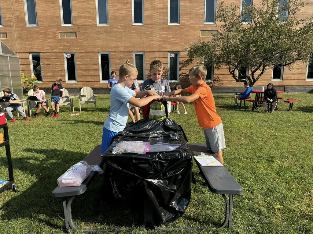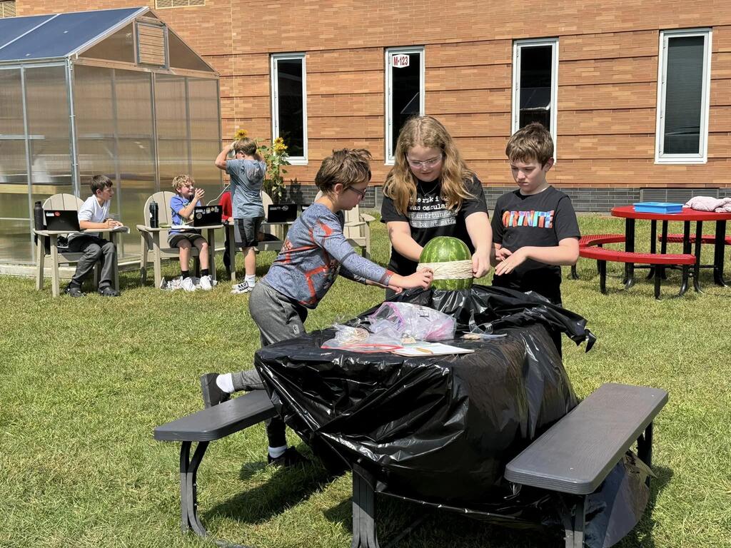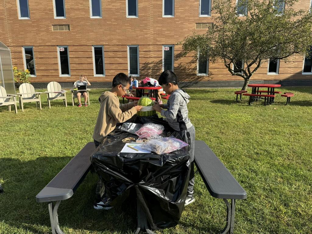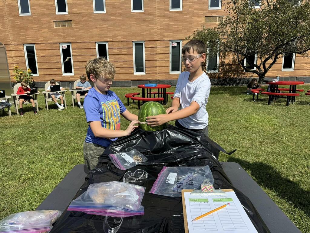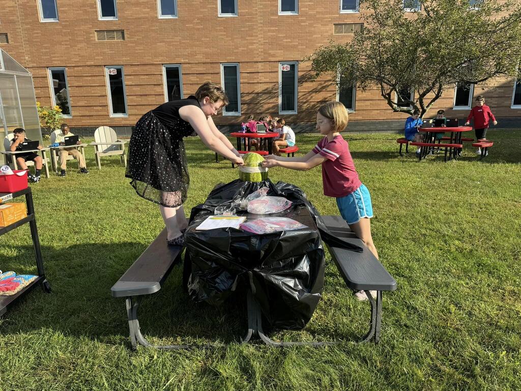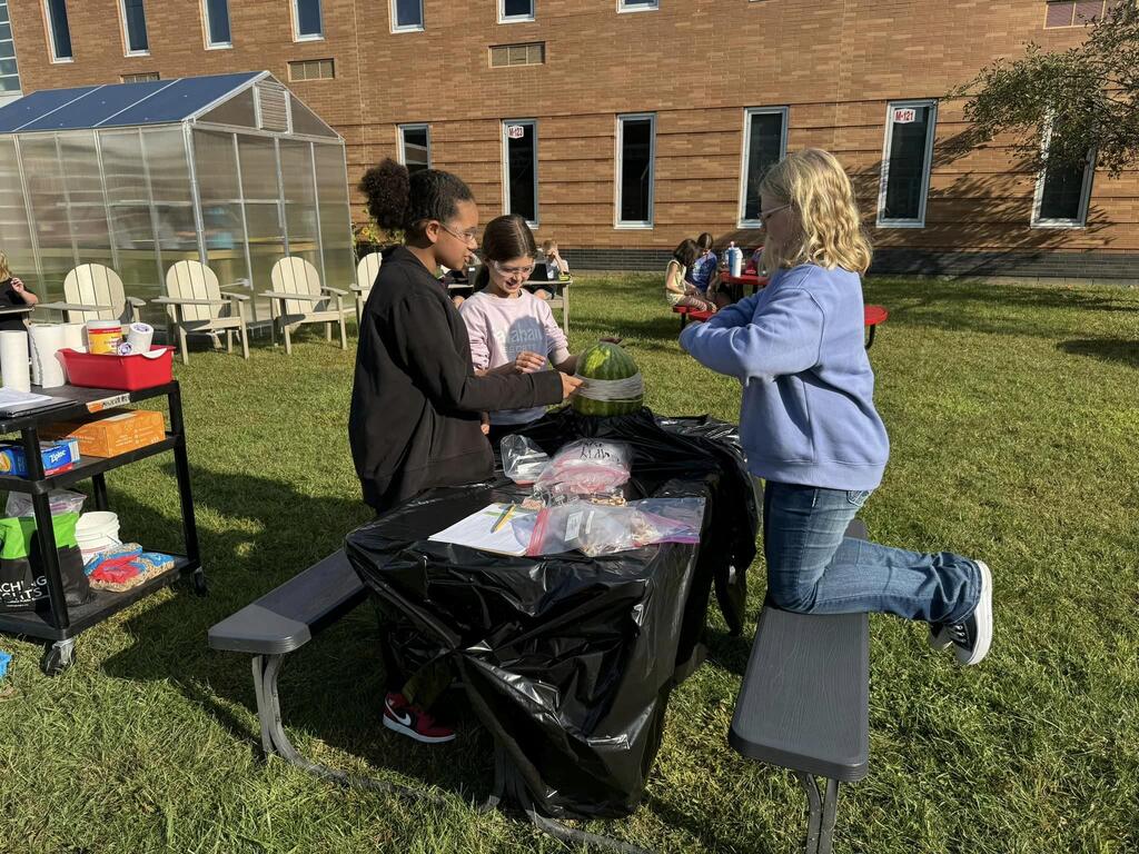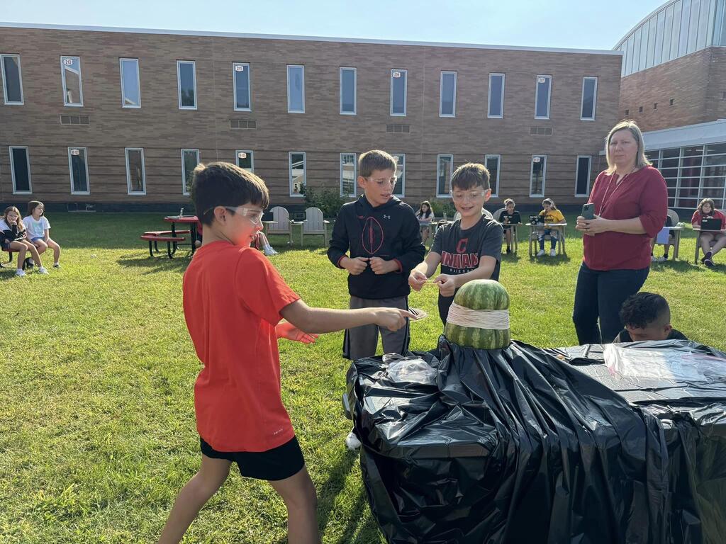 Students used the Scientific Method to determine how many rubber bands would be needed to make a watermelon burst. The morning science class watermelon had a lack-luster explosion after only 220 rubber bands but the afternoon class needed two days and 610 rubber bands for a much more exciting explosion!