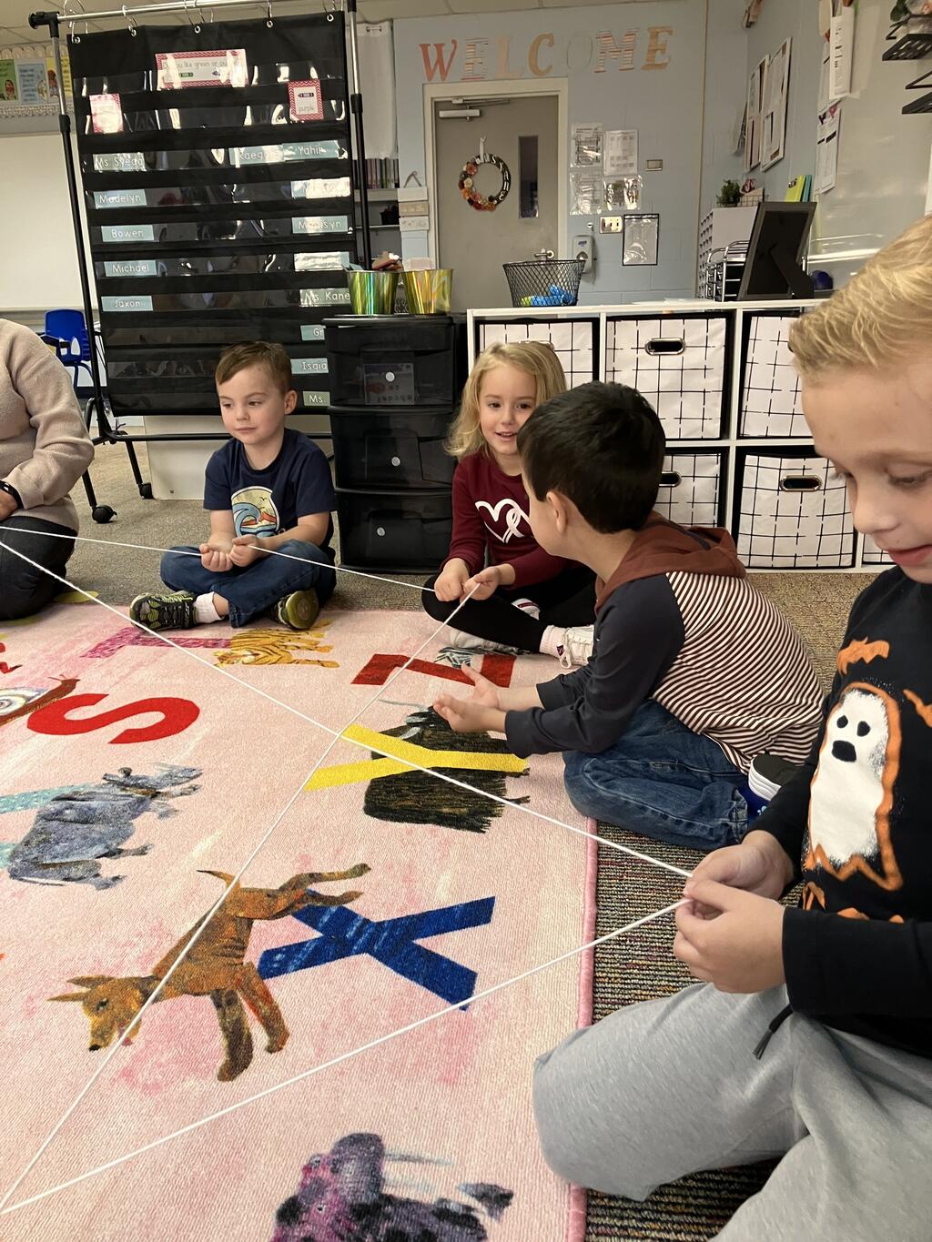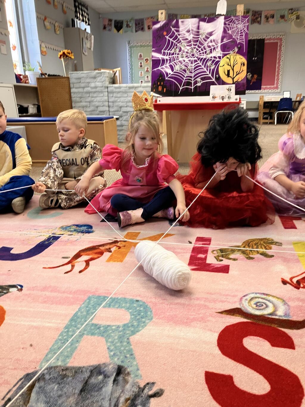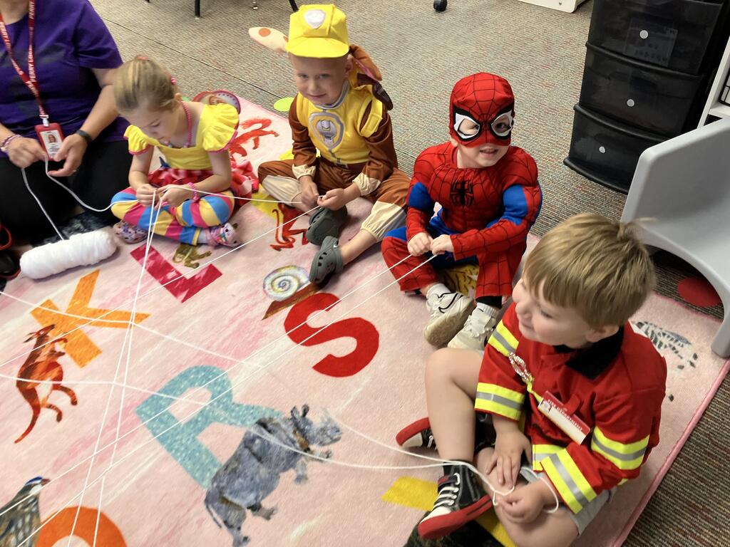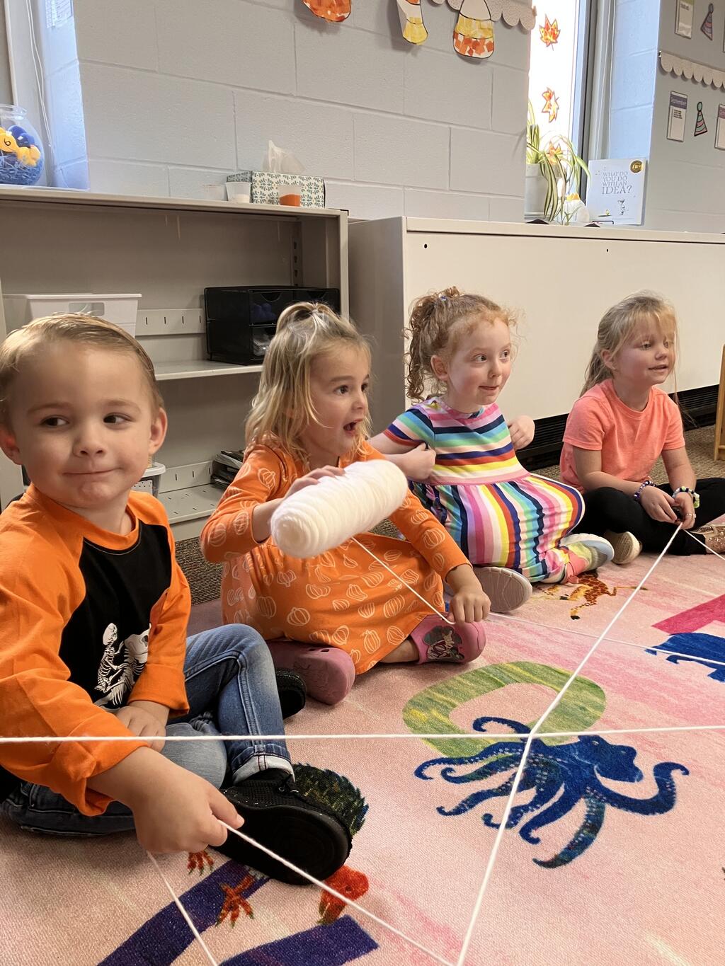 We learned that a team is a group of people that works TOGETHER! Our class is a team and demonstrated this by working together to make a spider web out of yarn. Everyone had to hold their piece of the yarn to ensure our web wouldn't fall apart. We practiced each day and even though this task was challenging at first we got better each day!