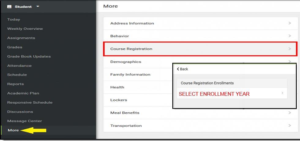 - In the Course Registration Enrollments window, select the enrollment year (typically next school year's enrollment). Example: If the current school year is 2023-2024 High School and you are currently in Grade 10, the next school year's enrollment is 2024-25 High School where you will be requesting courses for Grade 11.