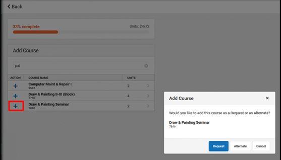 - Add the course by clicking Add Request or, click Add Alternate. This adds the course as an alternate course in case you cannot be scheduled into other courses.