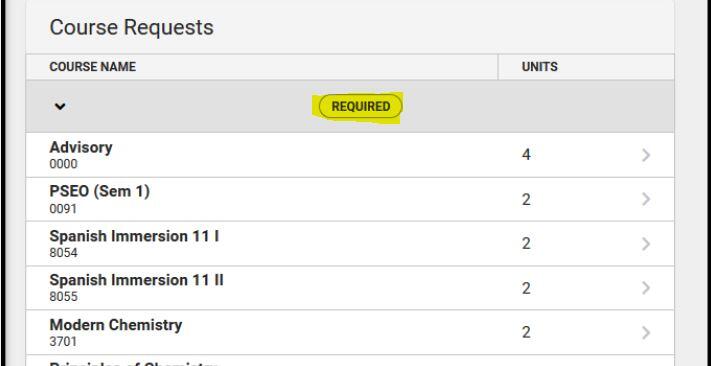 Courses your counselor added display as REQUIRED. Changes to these requests cannot be made, but you can discuss these with your counselor.