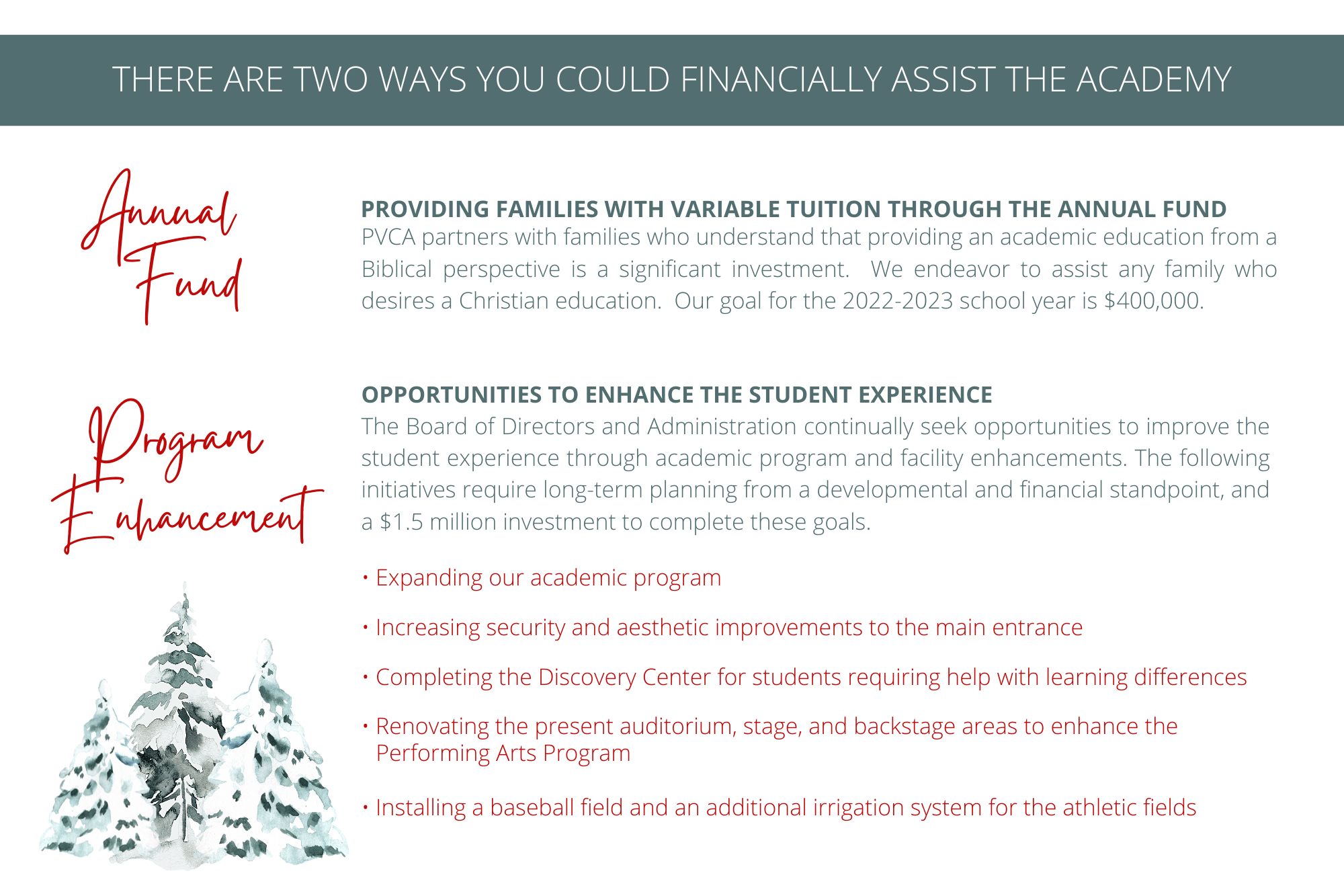 Over the 43 years that I have had the privilege to serve as Headmaster at PVCA, I have continually witnessed God’s faithfulness to our Academy and to our school families. From the humble beginnings in the basement of the First Baptist Church in East Longmeadow, to the improbable acquisition of Ursuline Academy, our current location, to the development of the athletic fields, and the amazing expansion of the gymnasium and academic spaces, the Lord has provided for both the immediate needs and the long-term vision of our Academy. I am confident that He will continue to meet the needs of the Academy through faithful donors who are willing to partner with us.