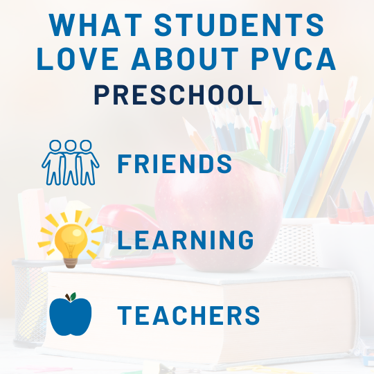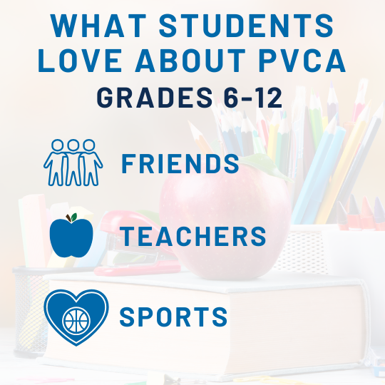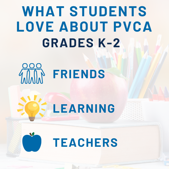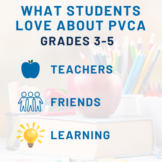 Our two children have been at PVCA for three years now and have loved going to school each day! They enjoy their regular studies and the special classes that are part of their week, such as music, art, gym, tech, Spanish, and chapel! The one-on-one attention that they receive by having smaller classrooms has been a blessing in their growth and learning. Their confidence is being built by the teachers uplifting their individual personalities and teaching each child on their level. It’s reassuring to hear our children share so positively about their school day each night and the excitement that they have to return the following day to see their friends and teachers.