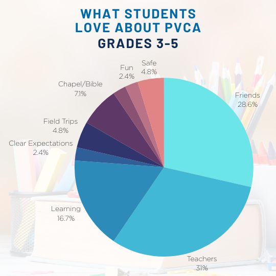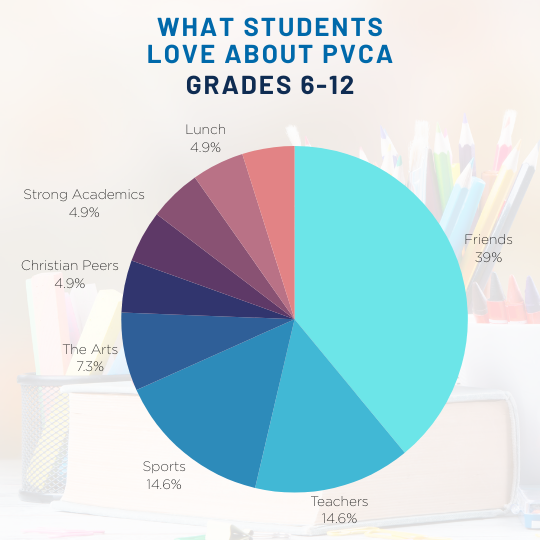 The culture and community, we absolutely love the camaraderie among the school personnel, students, and families. We value the importance the teachers place on being kind to all students and including everyone in activities. The no-nonsense approach to bullying and unflattering words shared is something that we truly think makes the environment of PVCA so warm and welcoming for all attendees. PVCA is an extension of our home and church with the same values being taught all day to our children by like-minded educators that care about their ministries by working to glorify God.