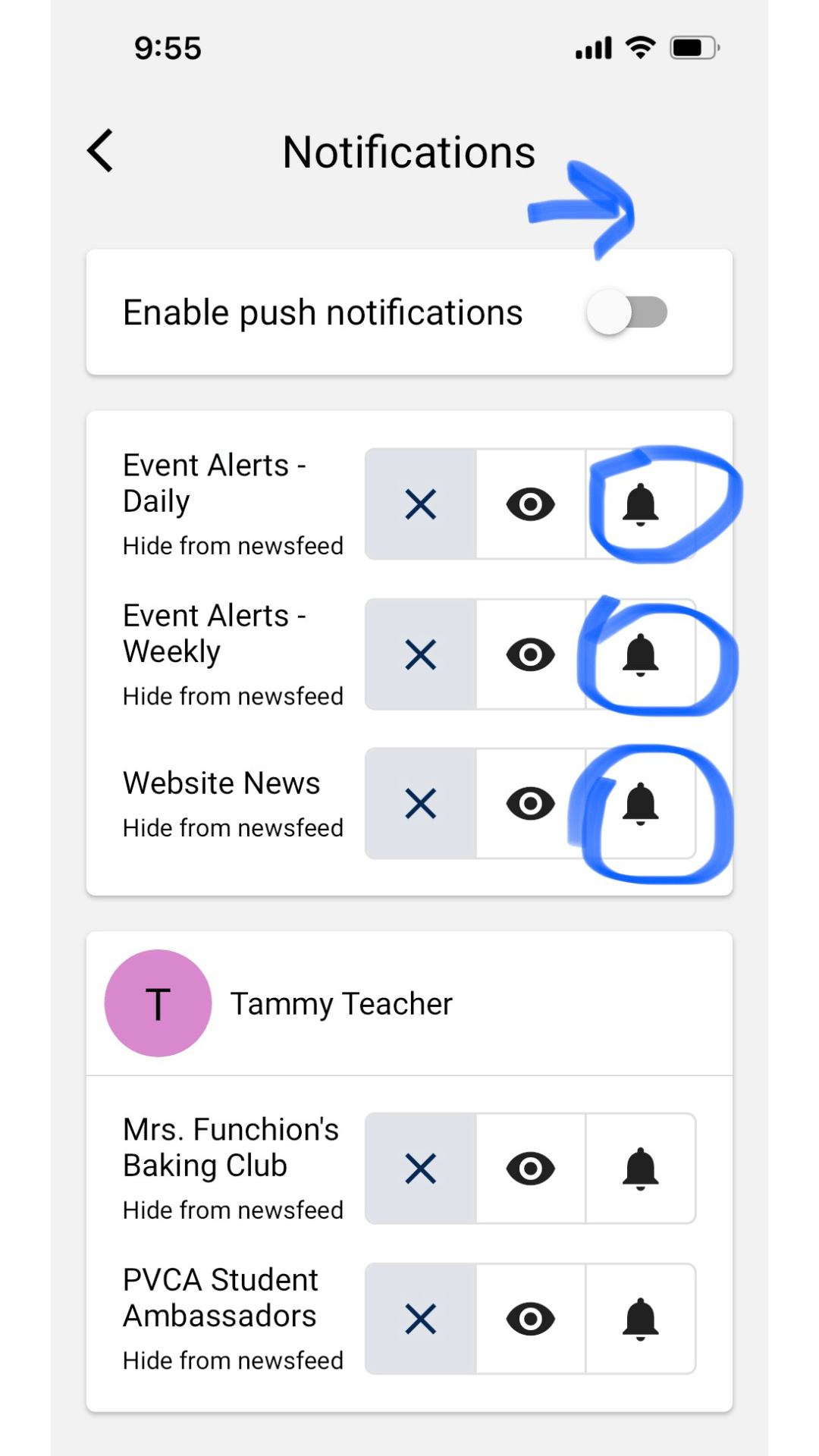 To stay informed, turn on all notifications. Individual teachers/classrooms will appear on the bottom half of the screen**. Parents and Students must “OPT-IN” to a specific teacher, club, or group to be notified.
