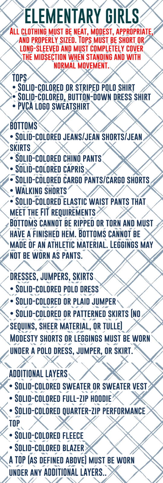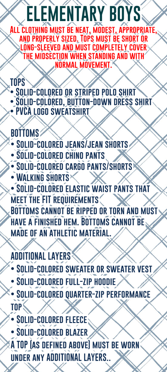 The PVCA dress code, or standard of dress, is posted on the website under the parents tab. Please review the dress code to be sure your son or daughter is following it.