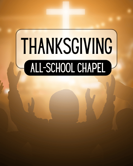 The Thanksgiving All-School Chapel will be held on Tuesday, November 26, in the auditorium from 2:00PM to 2:45PM. Due to space limitations, parents are not permitted to attend. Instead, the Thanksgiving Chapel will be available via a livestream. Click on the button to watch.