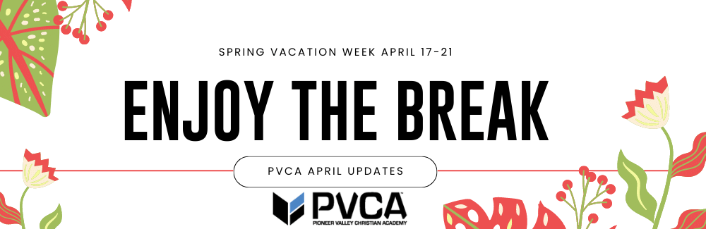 Pioneer Valley Christian Academy will be closed for spring break beginning Monday, April 17 through Friday, April 21. School will resume on Monday, April, 24, at 7:45am.