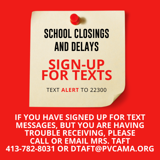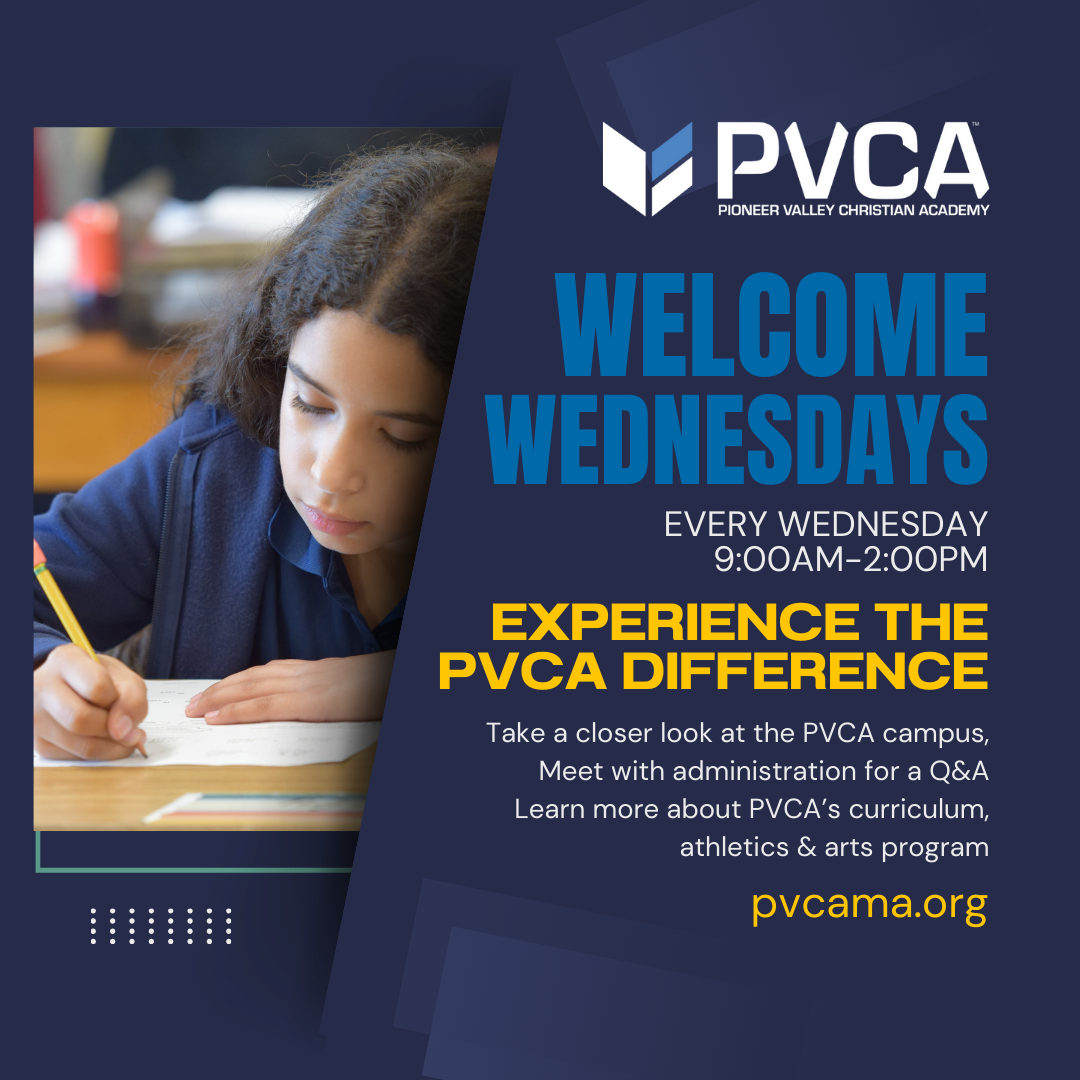PVCA’s number one marketing tool is YOU! If you know of a family that desires a great education in a positive Christian environment, invite them to a Welcome Wednesday where they will receive an education consultation and a tour of the campus. Welcome Wednesdays are EVERY Wednesday from 9:00AM-2:00PM. For more information, email Director of Recruitment and Retention, Mrs. Lisa Kerns, at lkerns@pvcama.org or call the main office at 413-782-8031.