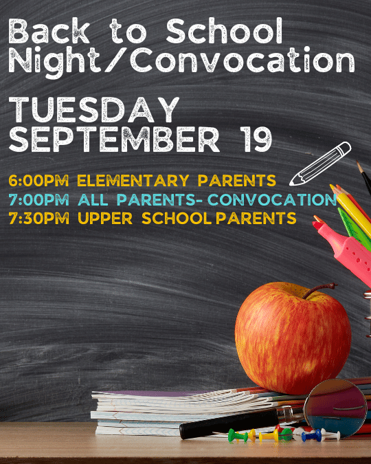 All-School Convocation will be held on Tuesday, September 19, at 7:00PM. Parents, administration, and faculty will gather together to ask God’s blessing on the 2023-24 academic year. Back to School Night will precede and follow the Convocation. Parents will have the opportunity to visit their student’s classroom(s), meet teachers, and hear about the upcoming year and student expectations. Please review the schedule below. This event is for PARENTS ONLY. Please arrange for childcare in advance. Thank you.