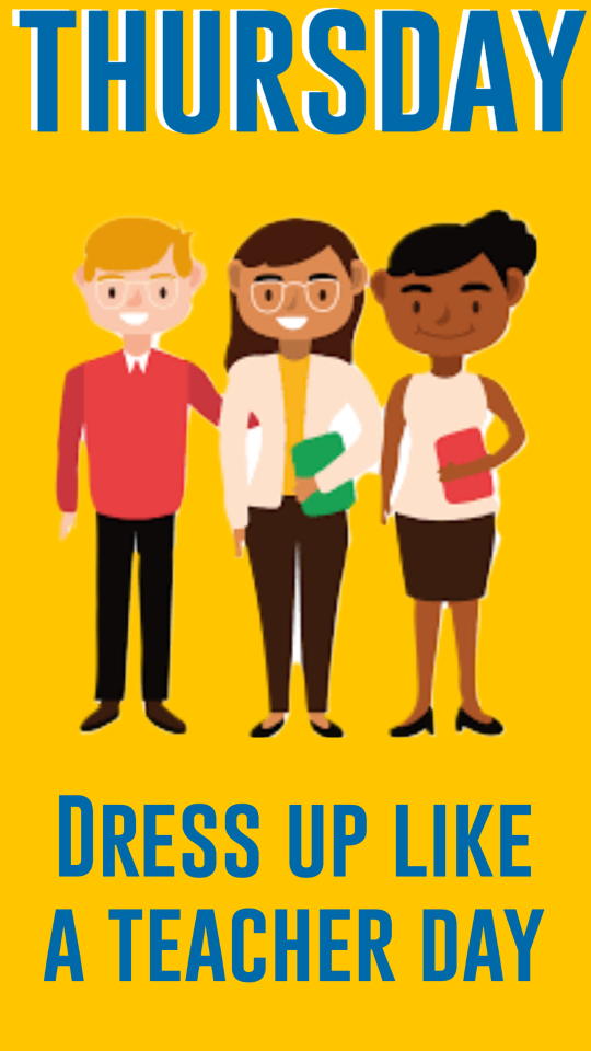 Have fun dressing like a teacher! What’s your favorite subject? Maybe you love art? Dress like Mrs. Annis. Maybe you love gym? Dress like Mr. Porter.