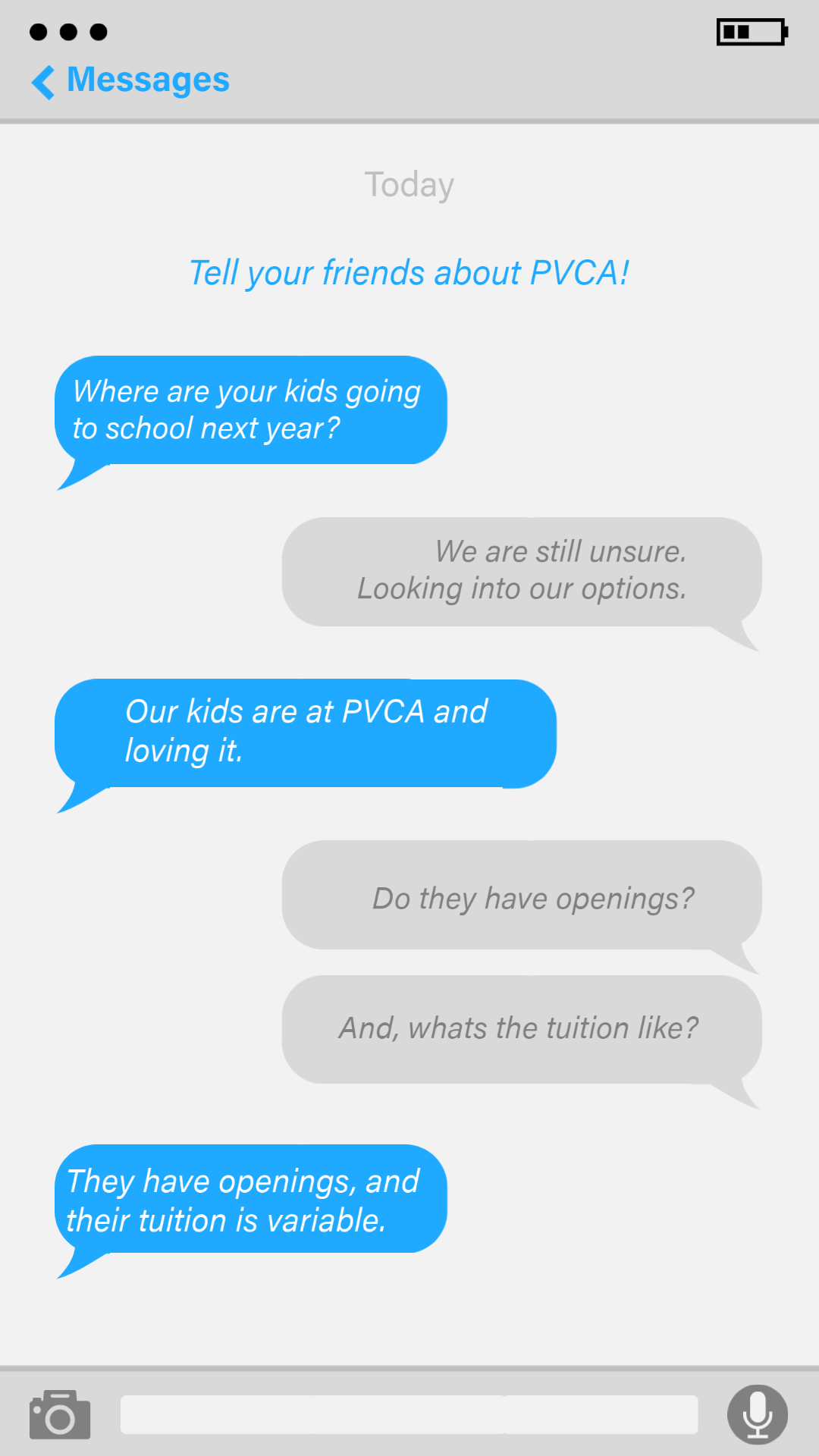 One Call Now is a service PVCA uses to alert the community with important notifications. Voice or text messages will be sent to you if our school must close or delay opening due to weather.