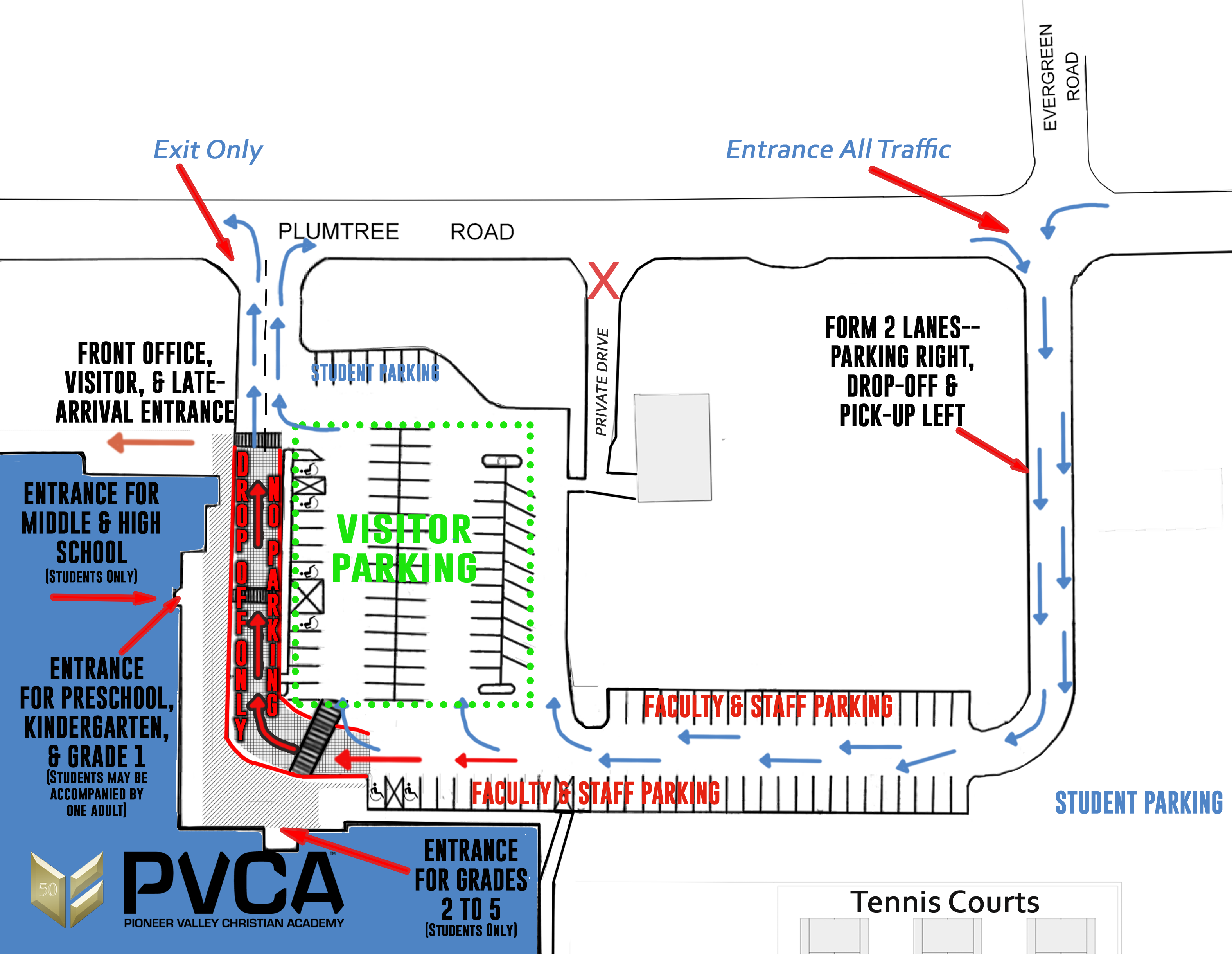 This year we will be utilizing the front door, the east side door, and the new gymnasium door for drop off and pick up. The west side entrance will not be utilized as PVCA will no longer be using the Evangelical Covenant Church parking lot. Please familiarize yourselves with the appropriate door for your child(ren) to enter during those times. The attached parking lot diagram will provide you with the flow of traffic and parking areas.
