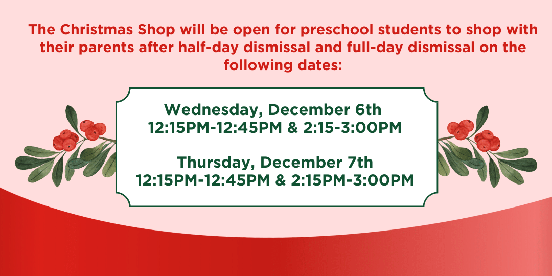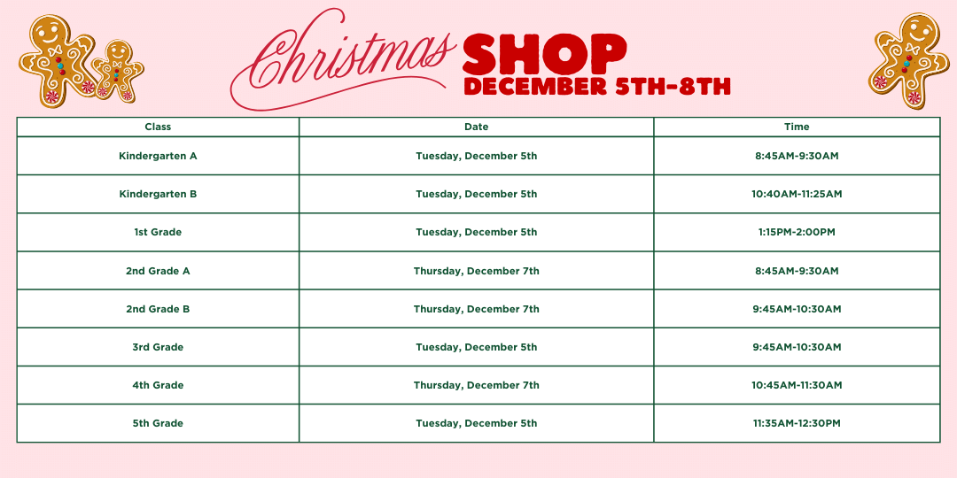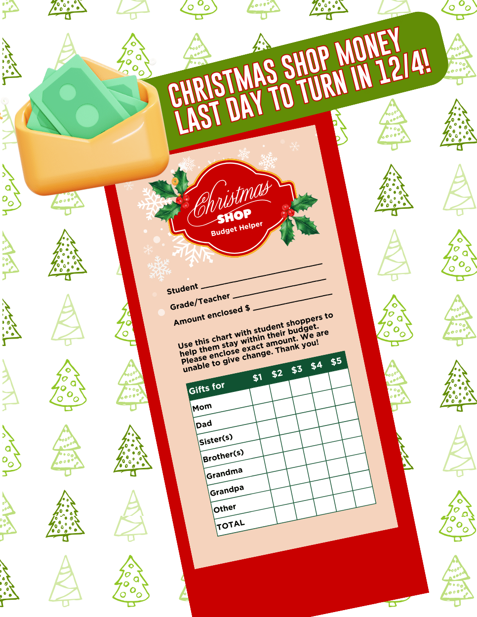 DEADLINE for Christmas Shop Money was Friday, December 1. However, the Parent Volunteer Organization will accept money on Monday, December 4.