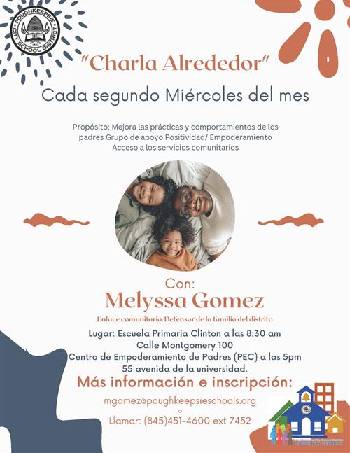 The Poughkeepsie City School District  Monthly Parent chats. Every second Wednesday of the month, join Melyssa Gomez Community Liaison/District Family Advocate  for "Chat Around". This gives the parents and guardians an opportunity to enhance parent practices and behaviors, be part of a support group, and access to community services.